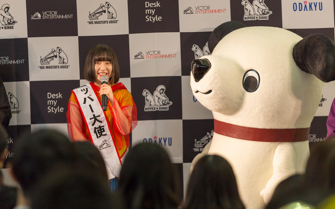 ビクターの犬のマーク“ニッパー”大使に就任した吉田凜音が、ニッパーとのコラボグッズのリリース発表イベントを2月24日に小田急百貨店(新宿駅西口地上コンコース)にて開催した。