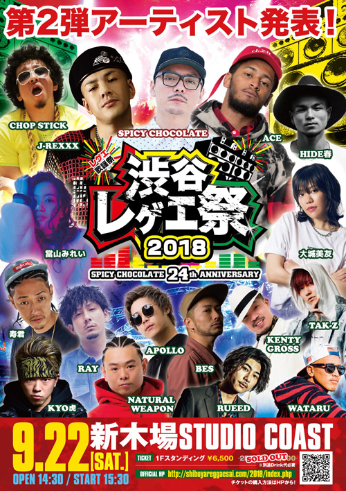 SPICY CHOCOLATEが主催するイベント「渋谷レゲエ祭〜レゲエ歌謡祭2018〜」の第2弾出演アーティストが本日発表となった。