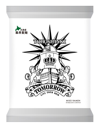 「白クマラーメン」などおみやげラーメンが人気の藤原製麺とコラボし、限定オリジナルパッケージのラーメンを数量限定で発売。「東方神起 LIVE TOUR 2018 〜TOMORROW〜」ツアーのロゴを全面にあしらったパッケージデザインはインパクト大。