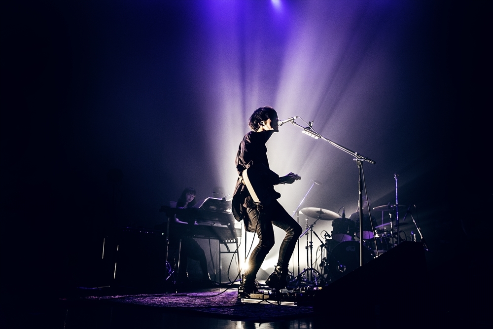 TK from 凛として時雨のステージは「kalei de scope」からスタート。ドラムのBOBO、ベースの吉田一郎不可触世界、ピアノの大古晴菜、ヴァイオリンの佐藤帆乃佳という強固なサポートメンバーとともに奏でられるアンサンブルはもはや鉄壁で、さらには映像演出も加わり、聴覚と視覚の両面で張りつめた世界観を展開していく。中盤ではアコギを用いた「haze」や、バラードの「memento」などを挟みつつ、イントロから大歓声の起きた「Fantastic Magic」や、印象的なピアノのループとカオティックな展開が折り重なる「Shandy」ではアグレッシヴに攻めたりと、緩急を生かしたステージ構成もさすがだ。