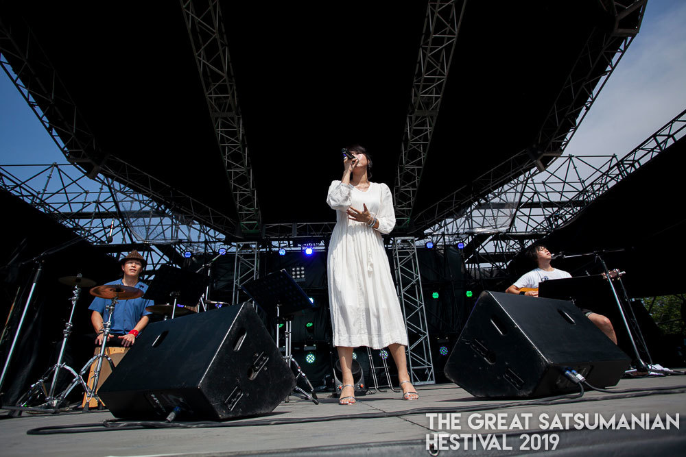 PAにリバーヴを要請して、民謡と思しき一節を歌ったEGACCHOは自己紹介を始める。実は鹿児島の大隈地区出身で地区の高校時代は生徒会長も務めたのになぜか不登校になり、別の高校へ。バンドメンバーには大学時代に出会ったと、バンドヒストリーまで達したところで、やはり大隈出身者として、来年はぜひ大隈ステージに出たいと力説。