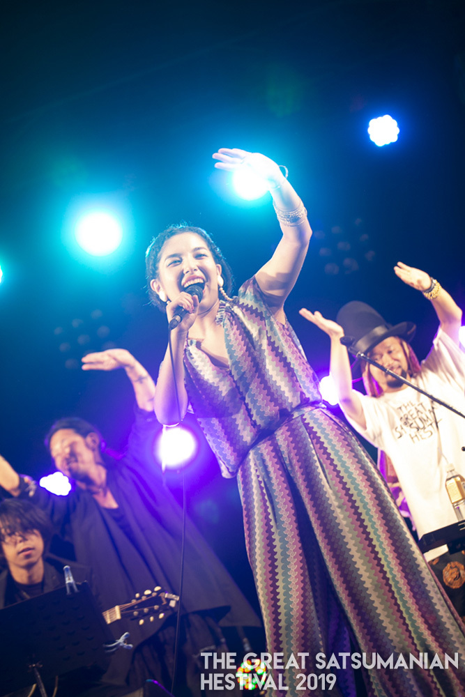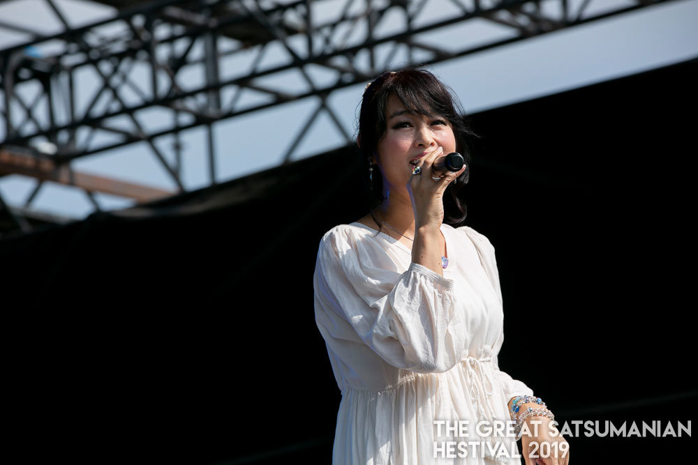奄美大島出身で、鹿児島で中高5年間過ごしたという彼女。「ただいま~!」の声に返される「おかえり~」は、いわゆるライブのテンプレとは違う印象だ。本当の親戚のようなニュアンスとでも言えばいいのか。続く去年の大河ドラマでお馴染みになった「西郷どん紀行」は、懐かしい唱歌とシマ唄、さらにオペラが出会ったような大作。壮大な世界観に続いては奄美の仕事歌「イトゥ」をオーディエンスに指南するというバラエティの豊かさ。