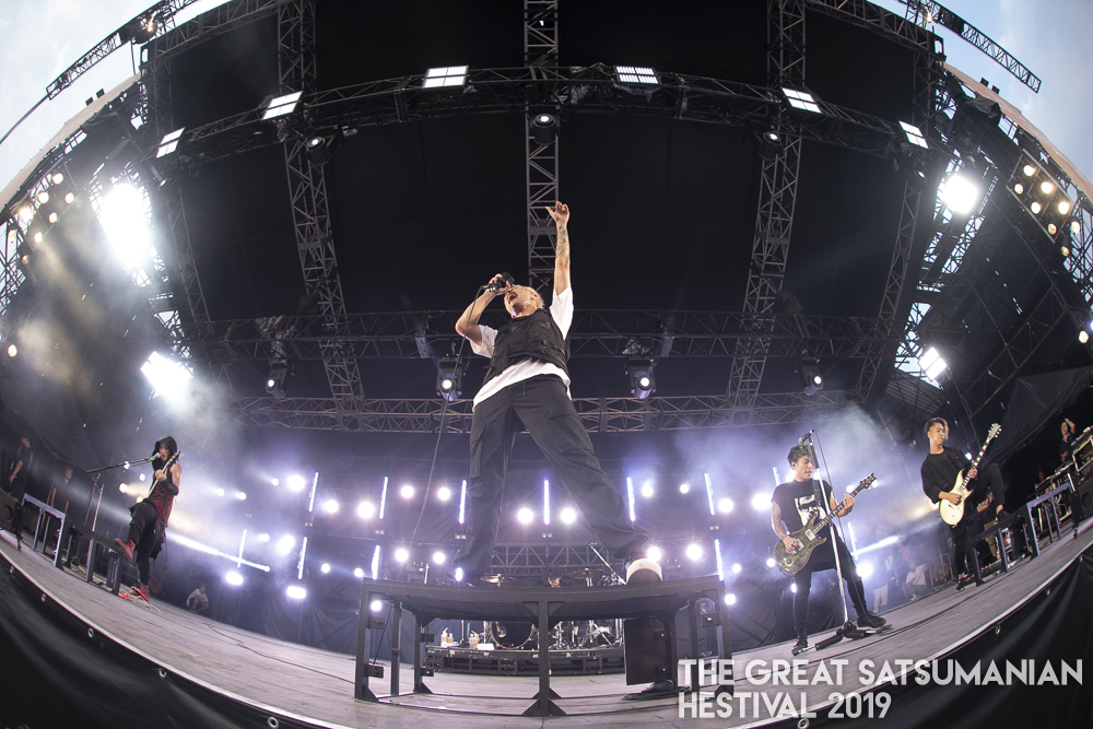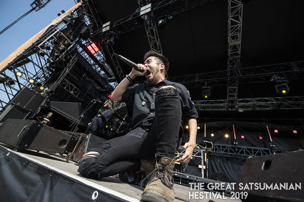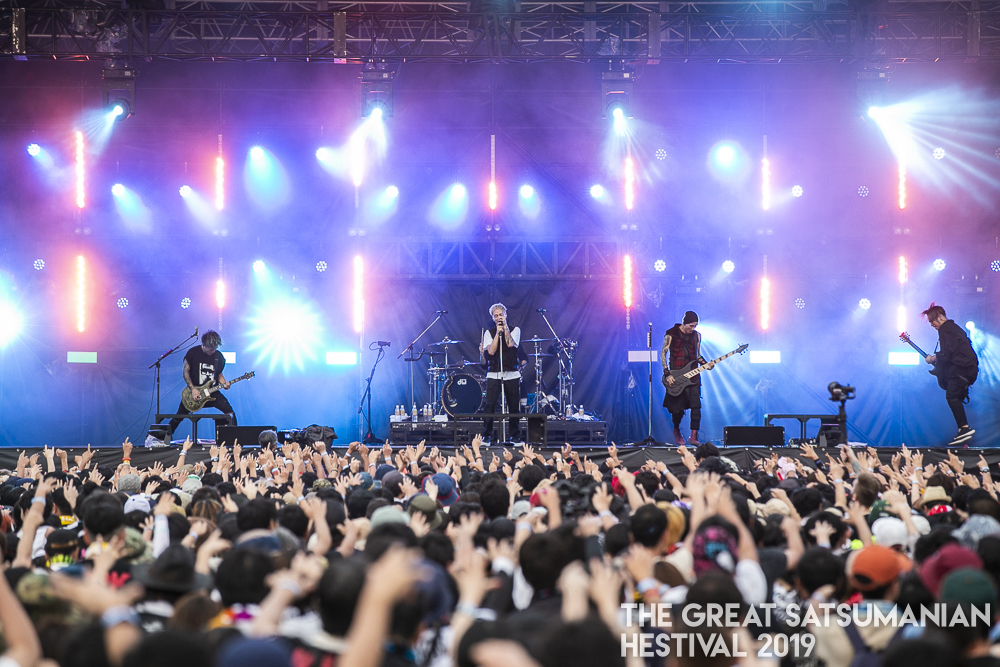 ハナレグミがチルタイムを演出し、時間帯的にもいくぶん涼しくなってきた桜島にcoldrainが再び火をつけた。まずは、「REVOLUTION」「ENVY」という人気曲で彼らにとって初となる鹿児島の地の感触を確かめる。そして、「(彼らの次に薩摩に登場する)マキシマム ザ ホルモンのためにあなたたちの体力1ミリも残すつもりありませんから!」と観客を挑発し、「FINAL DESTINATION」へ。終始安定したパフォーマンスを見せる彼らだが、なかでも「NO ESCAPE」は特によかった。キャッチーな歌メロを引き立たせるY.K.CとSugiによるツインギターがグイグイと曲を牽引し、実際のBPM以上の疾走感を吹き込んでいた。初の鹿児島で若干勝負に出たところもあったと思うが、新曲「THE SIDE EFFECTS」もいい反応を得られていたようだ。これには「いいね! いいね!」とMasato(Vo)。そして早くも、「来年もよろしくお願いしますね!」と運営側に2020年に向けて出演アピール。言葉だけではなく音楽で示すかのように、「F.T.T.T」では1度2度とサークルピットを作らせ、ラストへ向けてキッズとともに駆け抜けていく。