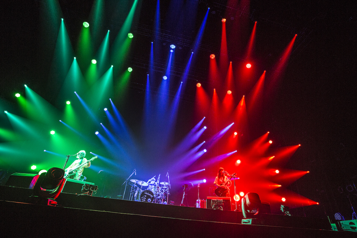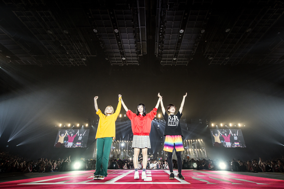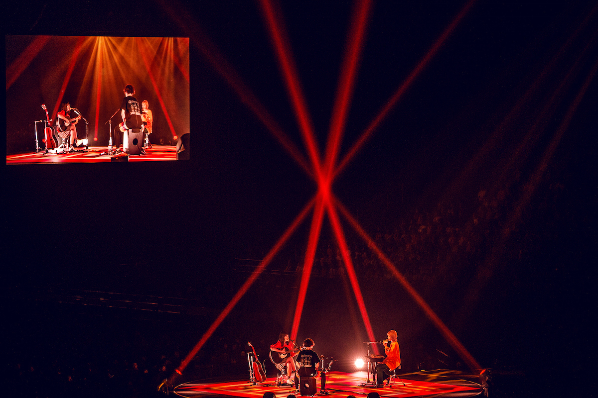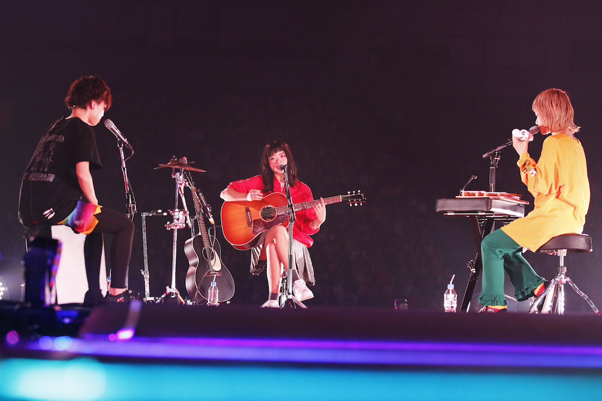 ステージセットで特徴だったのは、メインステージから円形の花道が設けられていたこと。そしてその花道の先端部分にセンターステージがあり、花道に囲まれた前列中央のエリアにも観客が入っていたこと。すぐ近くからはるか遠くまで観客が見えるのは、演奏する側にとっても、嬉しい構造だろう。メインステージの両サイドと中央にはLEDスクリーンが設置され、オープニングではその両サイドのスクリーンに、シングル曲のミュージックビデオやライブ風景のコラージュ映像が映し出された。さらにメンバー3人のリアルタイムの映像に切り替わっていくと、3人が互いの背中に手を当てて気合いを注入し、円陣を組んでいる。ステージにかけるメンバーの思い、ライブ直前の緊張感などが伝わってきて、こちらまで身が引き締まっていく。