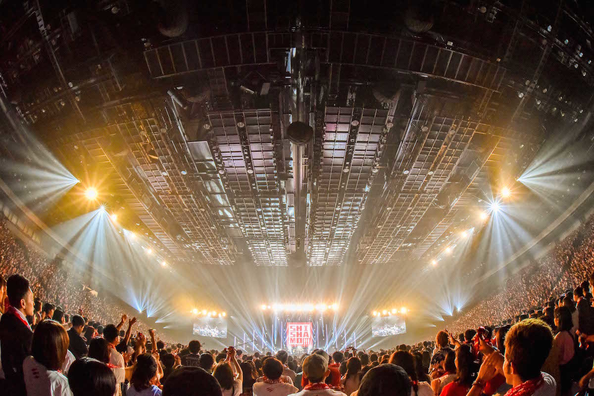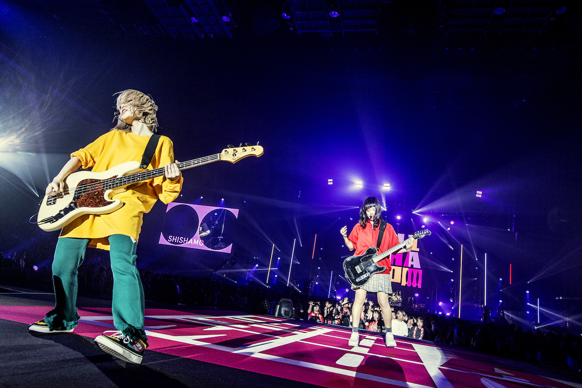「今日はベストアルバム記念のアリーナ公演となってます。ベストに入ってる曲、入っていない曲、いろいろやれたらと思っています」という宮崎の言葉に続いて演奏されたのはベスト盤には収録されていないが、SHISHAMOならではの魅力が詰まった曲、「きっとあの漫画のせい」。表情豊かな歌声としなやかさと歯切れの良さを兼ね備えたバンドサウンドが、気持ち良く響き渡っていく。松岡によるタオルの使用方法の説明で始まったのは「タオル」。1万数千枚のタオルが歌に合わせて、アリーナの中で同時にぐるぐる回る景色は壮観だった。アウトロでは宮崎と松岡が花道に出て、一周しながらの演奏。松岡の骨太なベースで始まったのは「BYE BYE」。ソリッドなギター、タイトなドラムが加わってのアンサンブルは切れ味抜群で、バンドサウンドのシャープかつクールな魅力も伝わってくる。