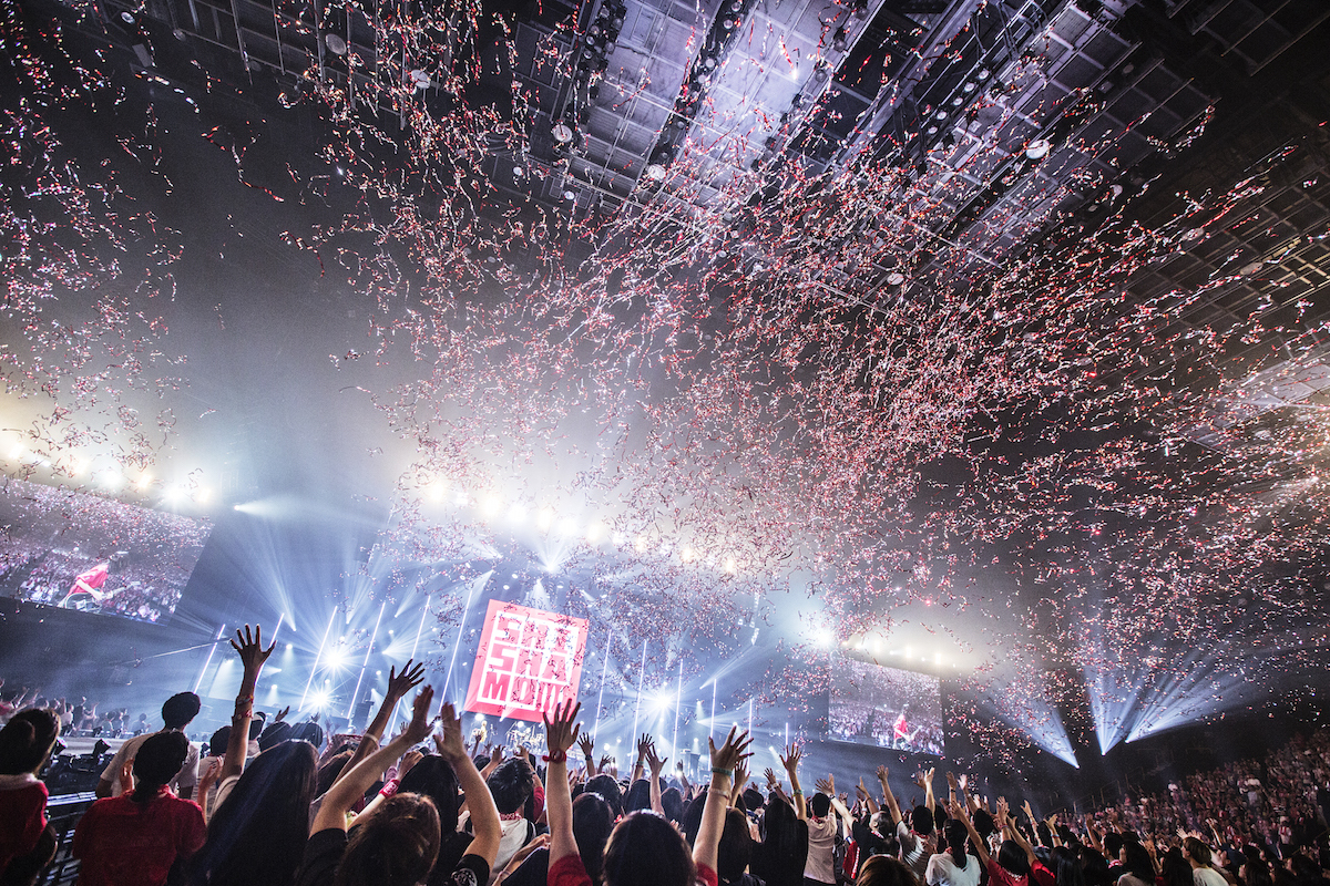 メインステージに戻って、ラストスパートで「君と夏フェス」「君とゲレンデ」と、全員参加型の曲がたて続けに演奏されていく。一瞬にして夏から冬へ。そんな展開も気持ちいい。本編最後に演奏されたのは「明日も」だった。銀色のテープが発射されて、観客が握りしめたテープが揺れる中、会場内の全員を鼓舞していくような熱くて、暖かくて、力強い歌と演奏によって、アリーナ内に爽快感と開放感と躍動感が充満していく。SHISHAMOにとっては観客が、観客にとってはSHISHAMOが、前に進んでいく上での大きな原動力となっているのだろう。アンコール時に松岡が、「みなさんが楽しそうな表情で観てくれたので、私も楽しく演奏することが出来ました」と言っていたのだが、この日のステージは双方向のエネルギーの交換会でもあったのではないだろうか。ミラーボールの光が降り注ぎ、エンディングではメリハリの効いた照明も一体となった気迫あふれる演奏が展開された。本編は気迫でスタートして、気迫でのフィニッシュとなって、熱烈な拍手が起こった。