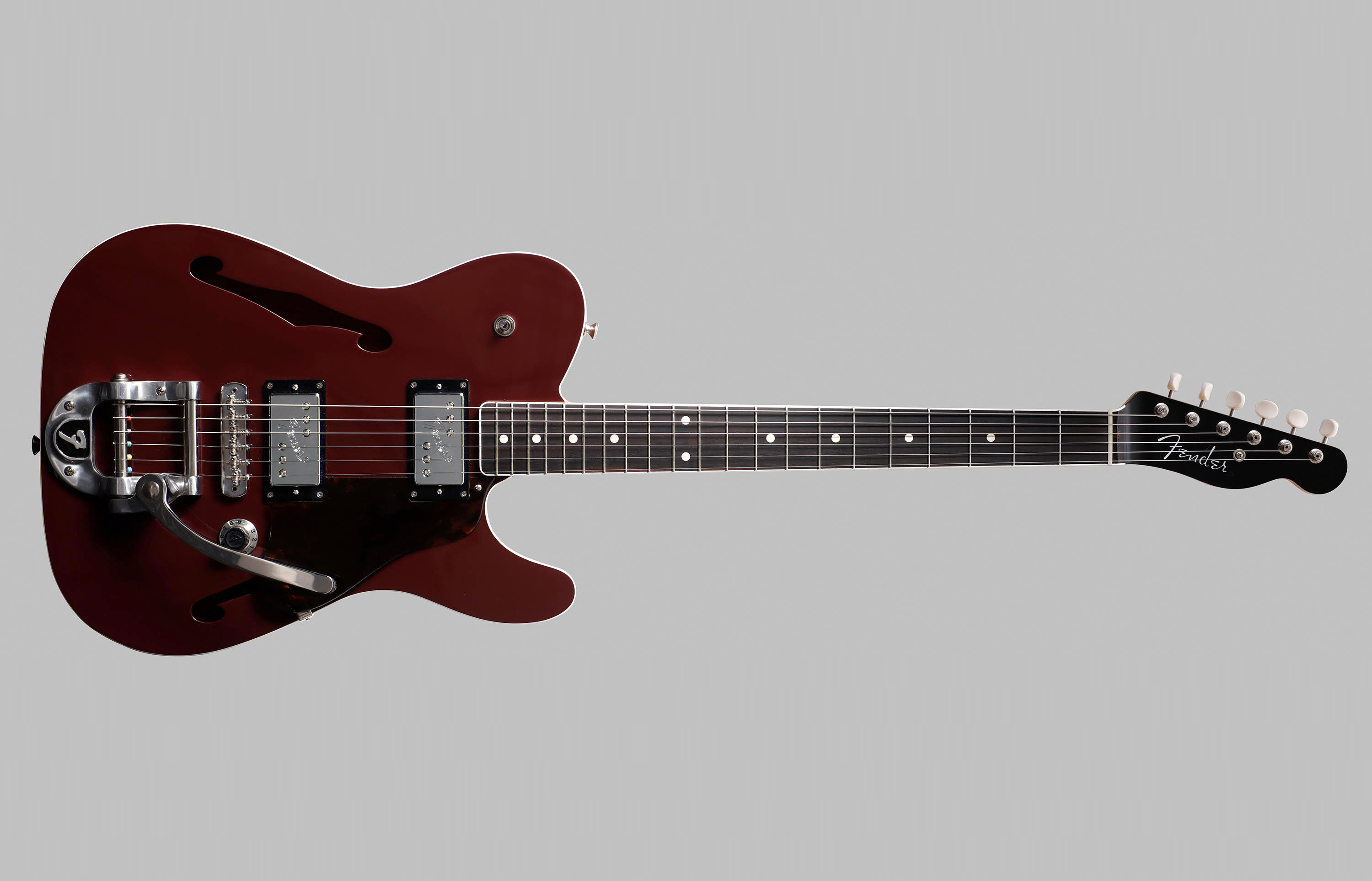 本製品はTELECASTER THINLINEをベースに、山内総⼀郎の理想のハムバッカーサウンドを実現するために数々のこだわりが盛り込まれた特別仕様。ボディーにホンジュラスマホガニーを採用しながら、ダブル F ホール構造で空洞部分を増やしている。
