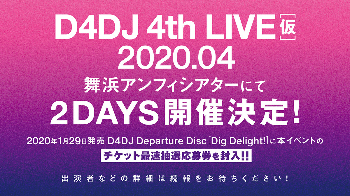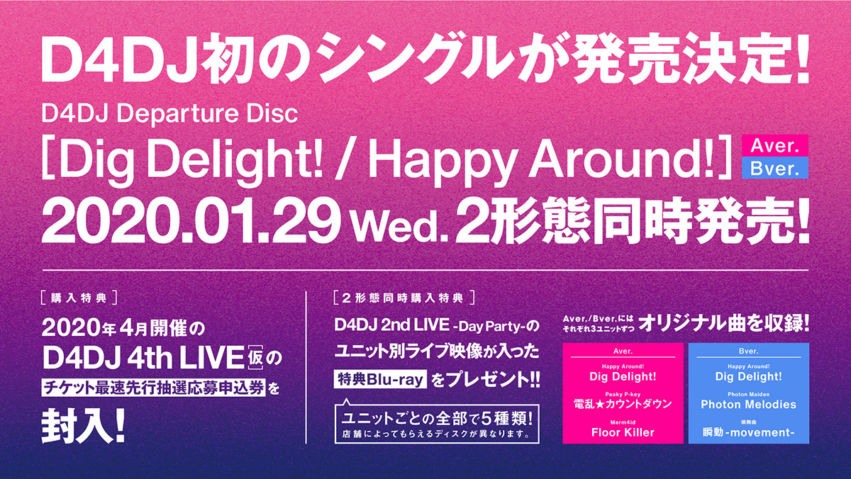 『D4DJ 2nd LIVE -Nonstop Night-』のステージ上では、さらに発表が続いた。2020年1月29日(水)に、D4DJ Departure DISC「Dig Delight!」が発売される。