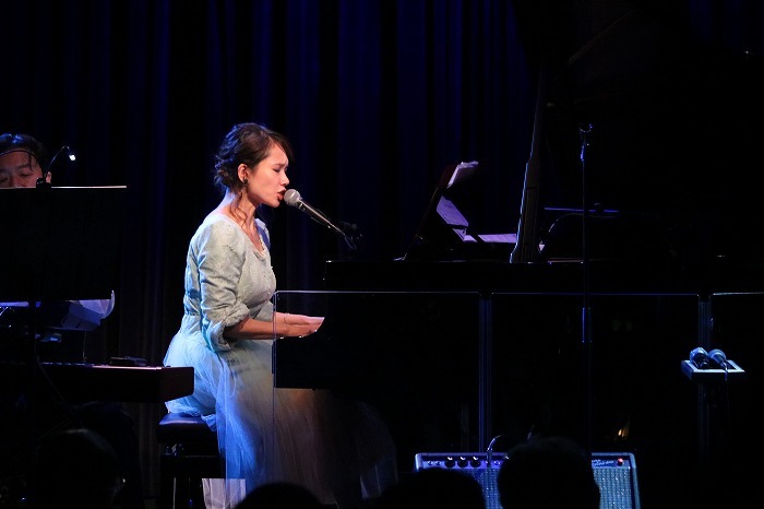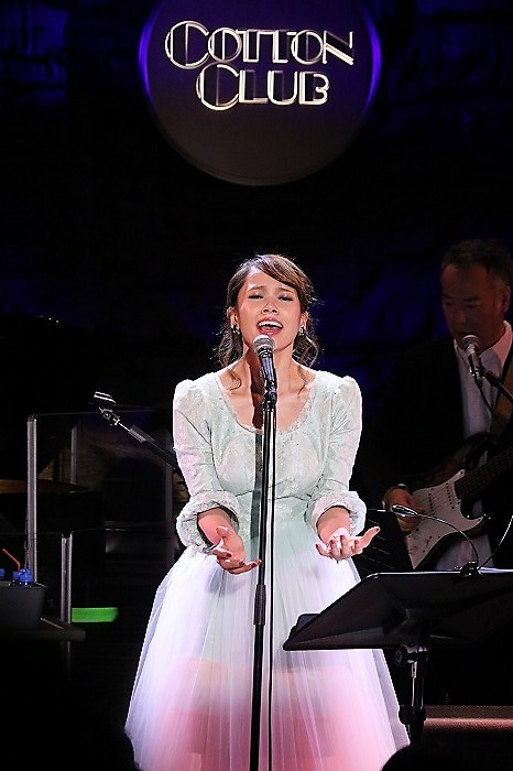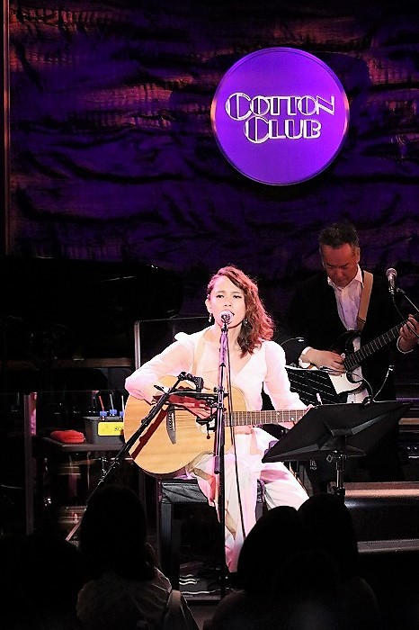 ほの暗いCOTTON CLUBのフロア。ステージにバンドメンバ―が入り、軽く音出しをしているとふっと暗転。そして会場の後方にスポットライトが当たるとそこには淡いペパーミントグリーンのドレスに身を包んだソニンがいた。