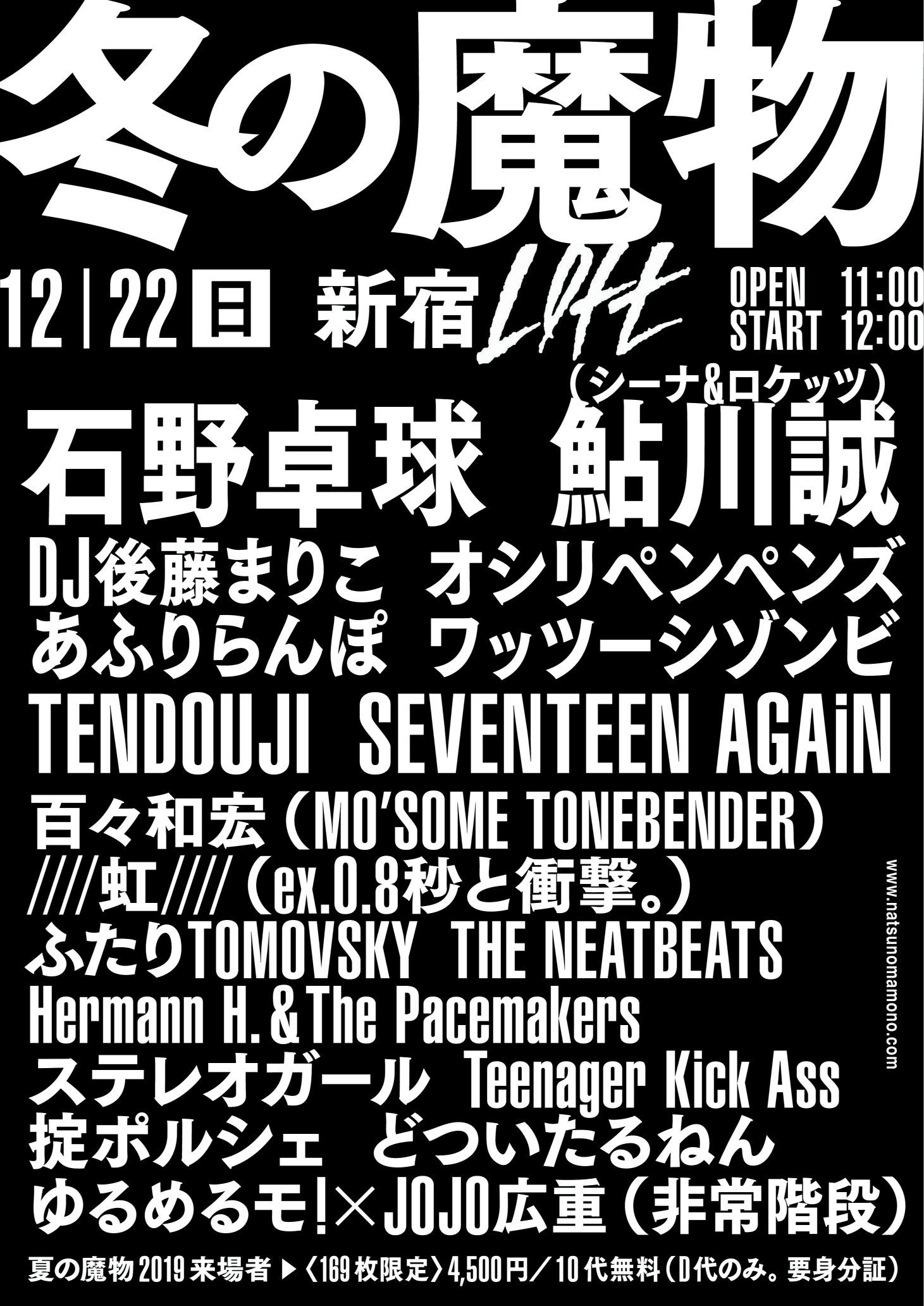 『冬の魔物』は、成田大致が主催する『夏の魔物』の冬編として行われるイベント。すでに、石野卓球、シーナ&ロケッツ鮎川誠、ワッツーシゾンビ、あふりらんぽ、オシリペンペンズ、DJ後藤まりこなど16組が出演することが発表されていた。
