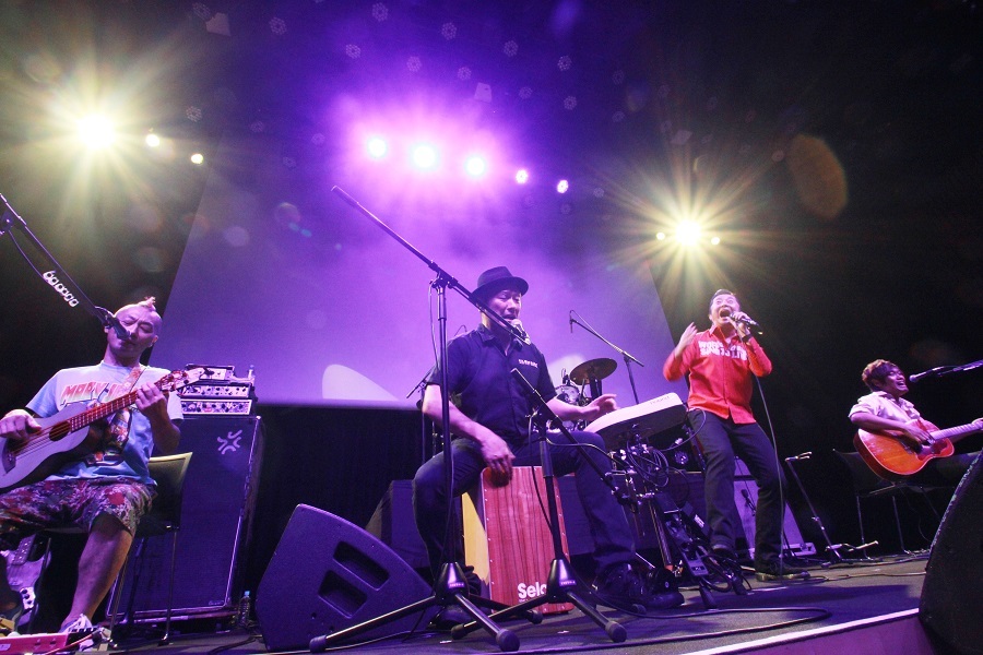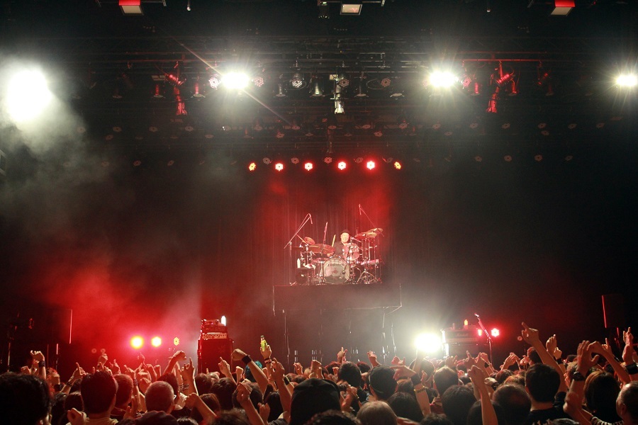 翌20日(日)は毎年恒例のドハツの日特別公演。サブタイトルが、25周年のときと同じく『秋の大感謝祭』が使われていたので、もしや…と思ったが、今回は怒髪天のみ出演。しかし、そこは怒髪天、予想のあさっての方角にボールを投げてくる。この日はSEから特別仕様。ソリッドなバンドスタイルを中心に、2mリフトアップするドラム台でドラムソロ、ギターソロ、アコースティックブロック、面白ムービー、カラオケコーナーではダンサーまで登場する等々…。オープニングからエンディングまで怒髪天流のザ・エンターテインメント・ショウを行った。