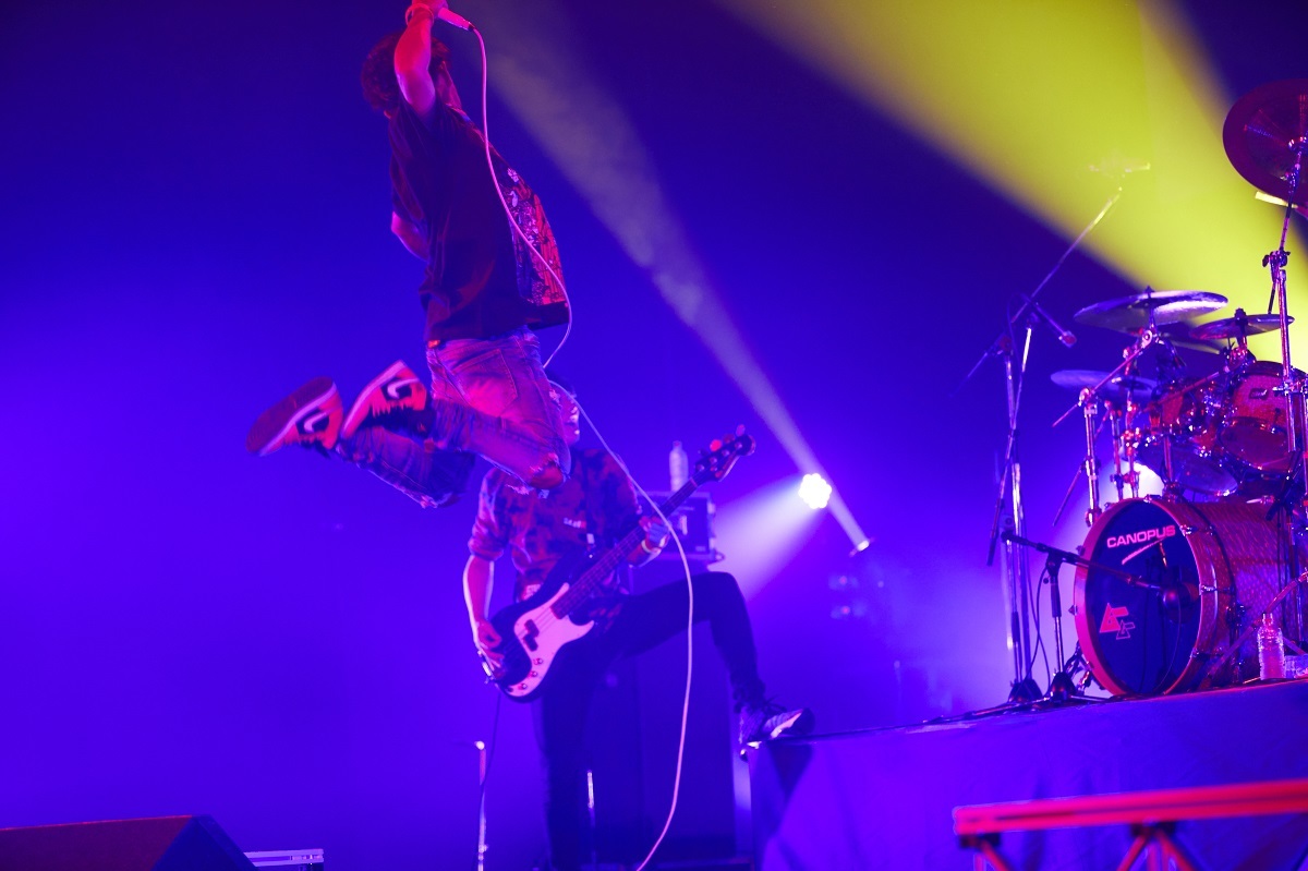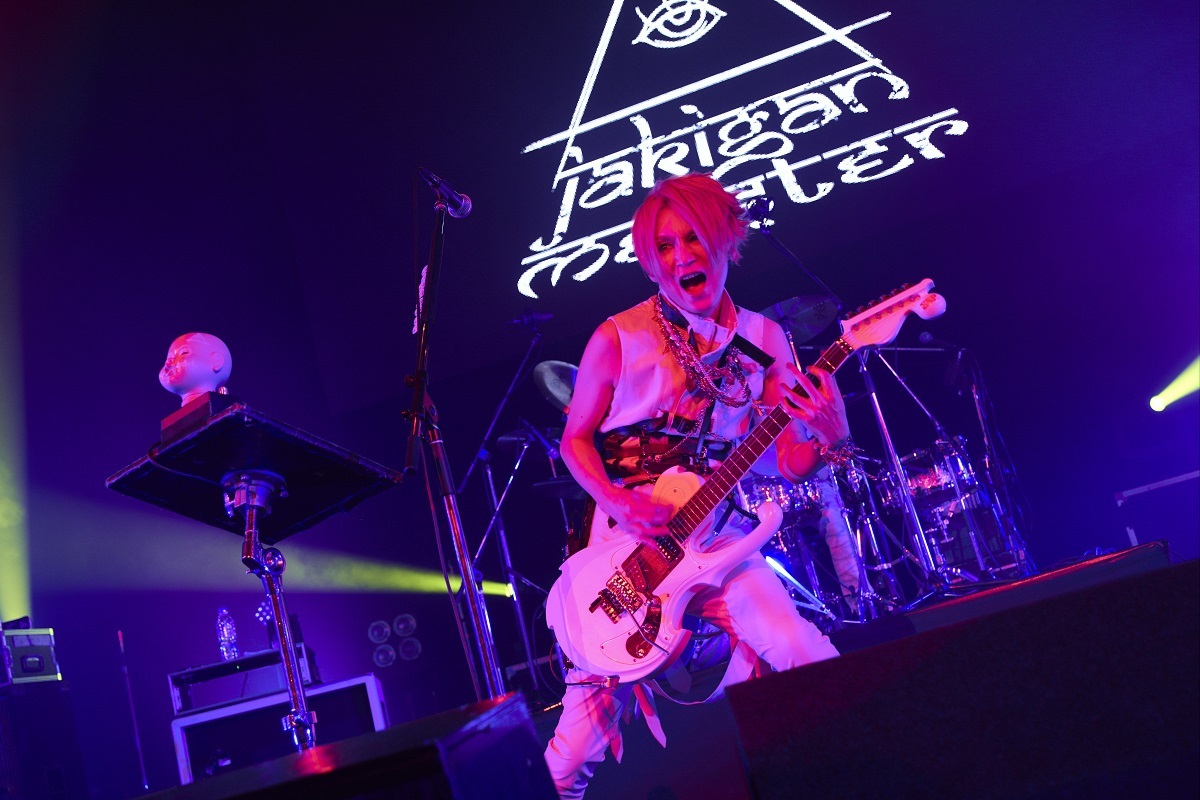 この日のトリをつとめたのは、咲人(Gt)率いるJAKIGAN MEISTER。中近東の匂いがたっぷり混ざったスパイシーなSEをバックに咲人(Gt&Vo)、Ni~ya(Ba)、Tooru Yoshida(Key)、HIRO(Dr)が真っ白い衣装で登場。咲人の耽美で端正な容姿が衣装でさらに際立ち、場内からは悲鳴が上がる。そんな美しさとは対照的な、キモカワな赤ちゃん顔形テルミン(目が光るとキモカワ度がさらに倍増!)を目の前に置いて、「DAWN」でライブはスタート。次はルーパーペダルでギターのリフを重ねながらファンキーなパーティーチューン「Crook」を披露し、オープニングから歌いながギタリストとしてどこまでチャレンジングなプレイができるのかというジャキガンならではこだわりのギター&ヴォーカルのあり方を、オーディエンスに徹底的にアピール。そんな咲人がボーカリストして大胆なファルセットにチャレンジした新曲「Halcyon」なども挟みながら、後半は「名状し難いほど有り余る邪気」までとことん一体感ある盛り上がりを作りだしていった。そうして、最後に「今日俺から伝えたいことはただ一つ。みんながつないでくれたその手は、俺たちは絶対に放しません」という言葉を残し、最後に「ワールズエンド」を演奏し、華麗に投げキッスをフロアにおくってこの日のイベントを締めくくった。