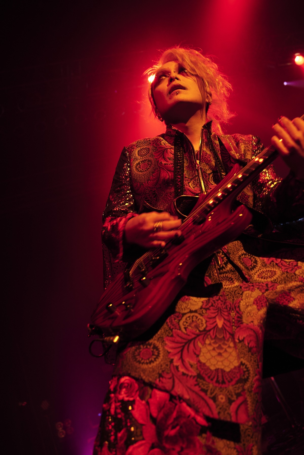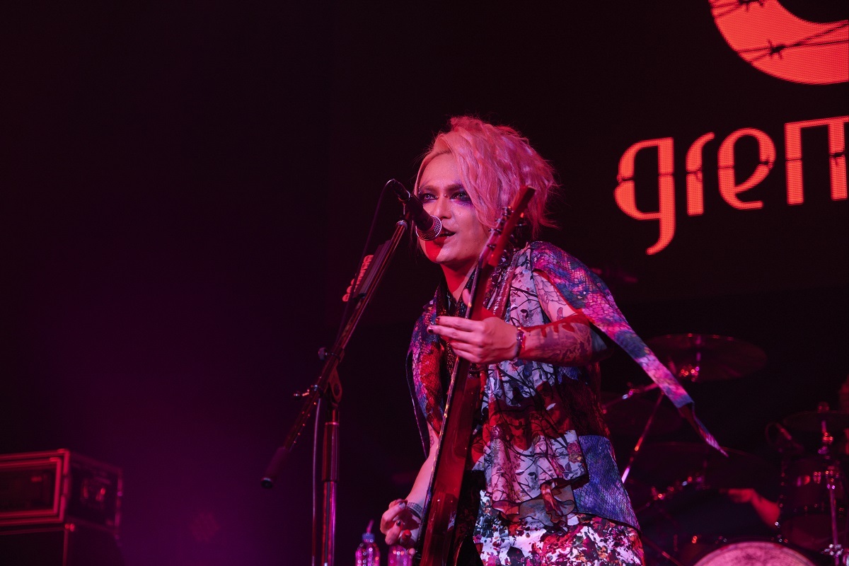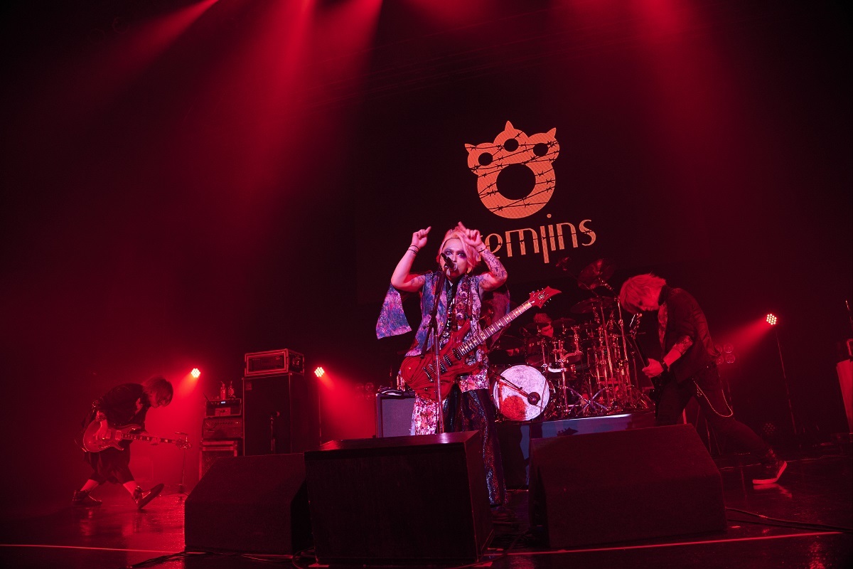 ハロウィンのようなダークファンタジーなSEが流れるなか、ヘアやメイクまでキメキメの派手な和モダンファッションで着飾り、狐のお面をつけた柩とKNZ(Dr)が率いるgremlinsが姿を現わす。KENZOの前に柩と、2人が全幅の信頼を置くサポートメンバーの関西勢・Chiyu(Ba)と美月(Gt)がフロアに背中を向けて構え、4人でアイコンタクトを交わしたあと、「HUNGRY.」でこの日のショーは開幕。NIGHTMAREでは飛び道具的なポジションでエフェクティブな声で楽曲を盛り上げていた柩だが、「mischievous」では本気の歌でぐいぐい曲をリード、「耳心過.」ではアッパーなバンドのグルーヴを腰でとらえ、体をクネクネ動かす妖艶なパフォーマンスで観客をどんどんのせていく。そうして、出演者のなかで唯一メンバー紹介をして「以後、お見知り置きを」と丁寧な挨拶でそれを締めくくったあとは、サプライズでカウボーイなビートを轟かせる新曲「snatch」を初披露し、ファンを驚かせた。そうして、後半は「the brilliant world」、「FLYAWAY」、「Bacchus」とおしげもなく盛り上がりの曲をかっちりと揃えて、最後までgremlinsならではの明るくチャーミングで陽気なロックンロールでオーディエンスを魅了していった。