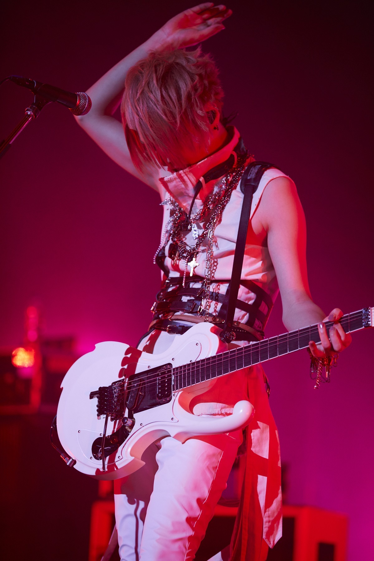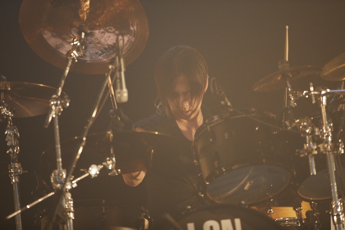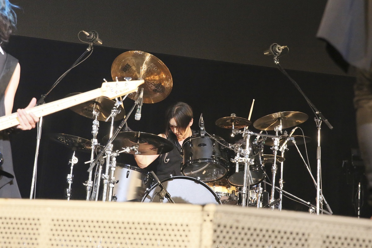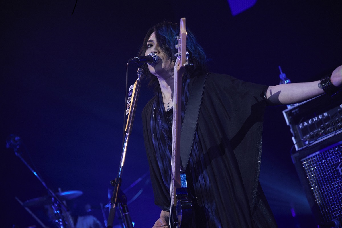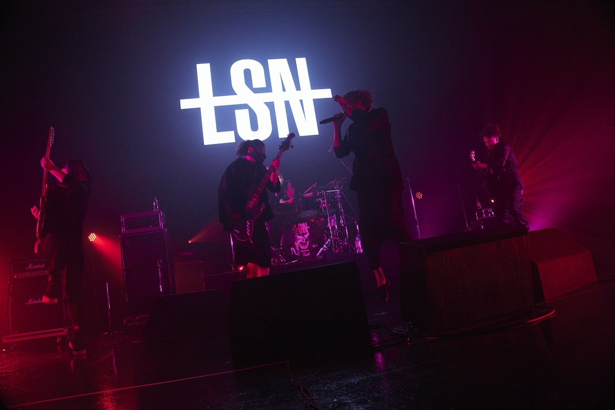 トップバッターを務めるのは、RUKAのソロプロジェクトであるLSNだ。昨年同様、1番手を狙うところはRUKAらしい。NIGHTMAREのメインコンポーザーらしく、5人のソロプロジェクトのなかではもっともダークでハードな歌ものサウンドを貫き、NIGHTMAREの遺伝子を色濃く匂わせるLSN。この日は髪を短く切ったRUKAを筆頭に、全員が真っ黒い衣装を着て登場。まずは挨拶代わりに「MODO NOSTRA」をじんわりと切り出し、ZEPP場内をどっぷりまっ暗闇へと飲み込んでいく。おなじみの「Cruel」ではヘドバンがあちこちに広がり、齋藤紳一郎(Gt)がハンドマイクでラップし、場内を盛り上げ、また、最新ミニアルバム『D.E.W』収録曲の「GAUDY」は、揺紗(Vo)が「声出せ!」、「はい、手拍子!」と歌の合間に叫んで、動作をガイドしながら観客をライブにどんどん引き込んでいった。そして「ZEPP TOKYO、盛り上がってる? このまま盛り上がった感じで」と揺紗が叫び「PARTY」からラストまで来場者とともに暗闇の快楽のパーティーでぶち上がる。「去年よりみなさんが協力的で楽しかったです」と揺紗がコメントしているなか、RUKAはジャケットを脱ぎながら真っ先にドラム台から立ち去っていった。