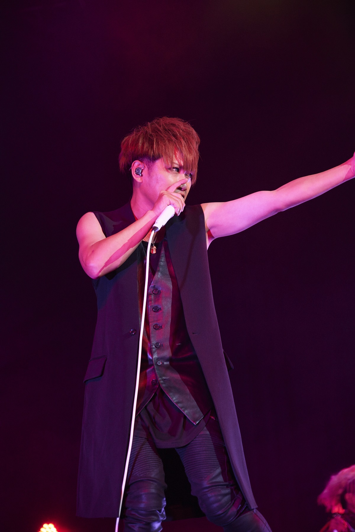 カラフルなレーザービームがこれでもかという勢いでバンバン飛び交う場内、EDMが爆音で鳴り響くと場内の雰囲気がガラッと変わる。続いてはYOMI改め“淳”が率いるTAKE NO BREAKが登場。真っ白いロングケーブルがついたマイクを持ち、ダメージジーンズにTシャツ、足元はスニーカーというヴィジュアル系とはまったくかけ離れたルックスの淳が、早速フロアにクラップを求め、ライブは「HUNGRY」の破壊力あるアッパーなビートで開幕。音とレーザービーム、照明が三位一体となってライブ空間を埋め尽くすなか、「Take my hand」では全員をジャンプへと導き、オーディエンスのテンションをどんどんあげていく。「今日を楽しみにしてました。最後まで楽しんでいこうぜ!」と淳が叫び、ミラーボールにレーザーをあて、きらびやかな空間を作って見せた「act in the dark」、タオルを回しダンサブルなミクスチャーサウンドで心地よく躍らせた「Jump in the Sound」とフロアを容赦なく盛り上げていったあと、最後にできたてホヤホヤの新曲「Never Leave You」を届けてライブを締めくくった。