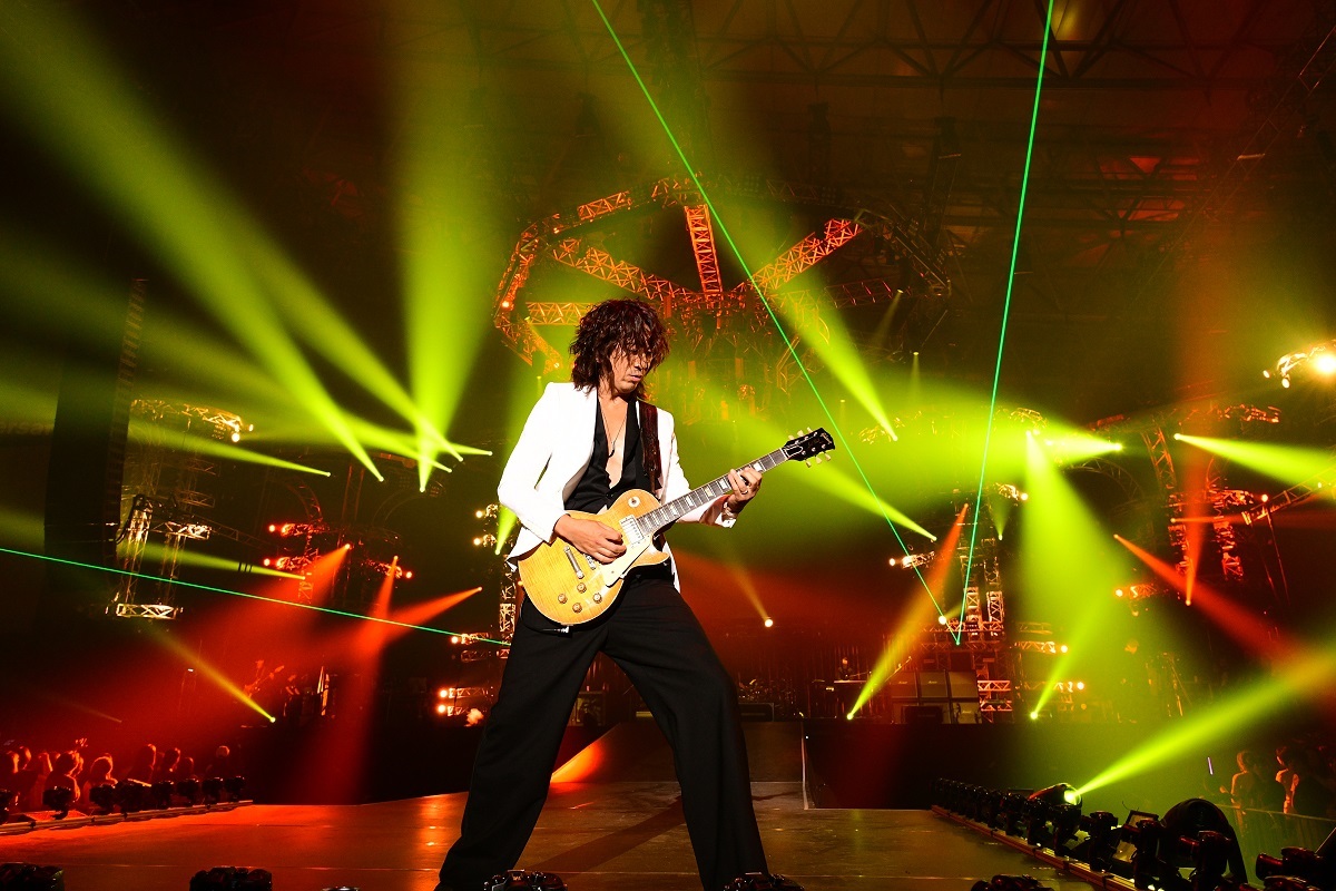 インディーズ時代の衝動をいまに蘇らせた「Flowers Gone」では、センターの花道へ歩み出ると、初見のお客さんも関係なく、その場所にいる全員を巻き込んでいく。かつて20万人ライブの伝説を打ち立て、現在までメンバーチェンジも、活動休止もなく、ライブの現場を大切にし続けてきたバンドの結束力と掌握力だからこそ作り出せるステージだ。MCで、後輩から先輩に「良いバトンを渡したい」と語りかけたTERUが「そのためにハートと愛をぶつけてほしい!」と伝えると、HISASHI(Gt)とTERUが向かい合って演奏が始まった「THINK ABOUT MY DAUGHTER」で、悲鳴のような歓声が上がった。そこに「G」と書かれたバルーンが投下。JIRO(Ba)とサポートドラム・永井利光の繰り出す躍動感のあるグルーヴに湧いた「AMERICAN INNOVATION」で、会場がタオル回しで一体になると、最後にTERUが「台風15号、19号で大変な被害に遭われている方もいると思うけど、少しでも夢をもって前進し続けてほしい」と願いを込め、美しき未来へと疾走する「BEAUTIFUL DREAMER」を届けた。「みんな夢見ていこーぜ!」と力強く叫んだ最後の一声に至るまで、大きな愛が溢れたライブだった。