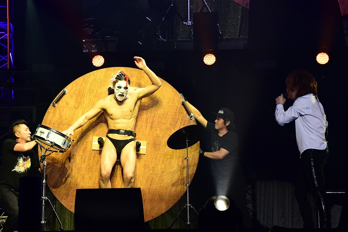 一方、樽美酒は丸い板に縛られ、縦回転される体をはったネタだ。ヘドバンをしすぎて首を痛めることを歌った新曲「首が痛い」では、曲中に“高速GLAYチョップ”を挟んで、歌詞の一部を“ひじ痛い”に変える場面も。この後に出演する先輩バンドをイジる怖いもの知らずのステージだったが、これこそゴールデンボンバーらしいリスペクトの表し方なのだろう。
