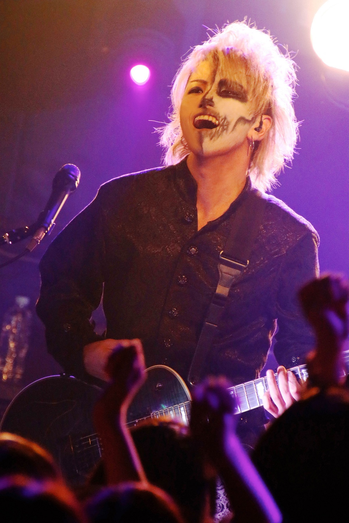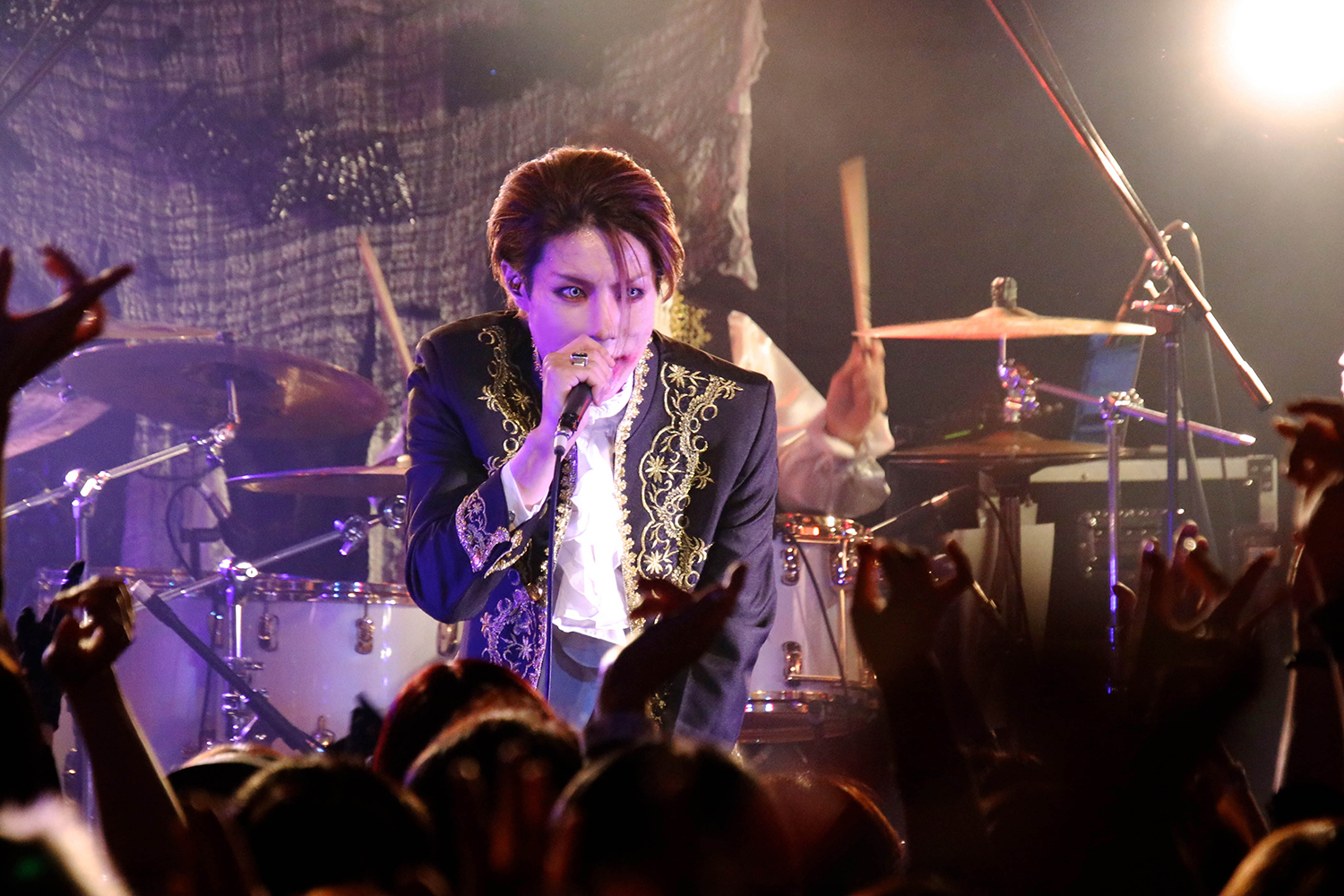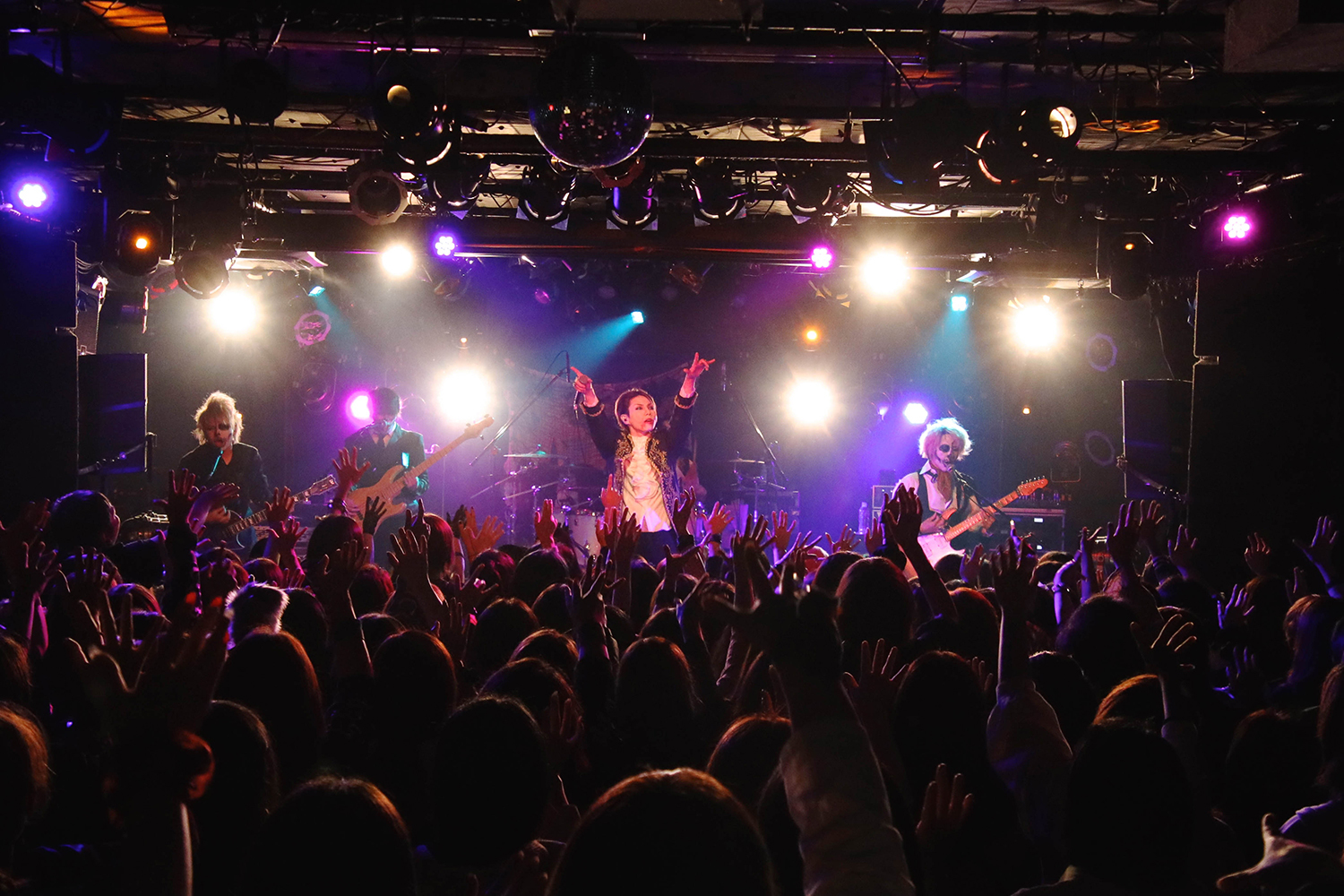ミステリアスな雰囲気の中メンバーが幕越しで登場し、披露したのは新曲「白塗りの唇」だ。ステージを覆う薄い紗幕にはメンバーの姿と歌詞が浮かび上がる仕様となっており、艶のある歌声が相まって妖しげな雰囲気を作り上げていく。今回のワンマンでは、コンセプトに沿った一夜限りのSpecial Songを1曲披露すると事前に告知されていた。それを一発目で披露するというまさかの展開に度肝を抜かれつつ、そこから間髪入れずに「Cyber Lover -仮想世界の女神-」へ。拳を上に突き出し、 Shindy(Vo.)が「お前ら叫べ!!」と会場を煽り、力強く歌い上げた。