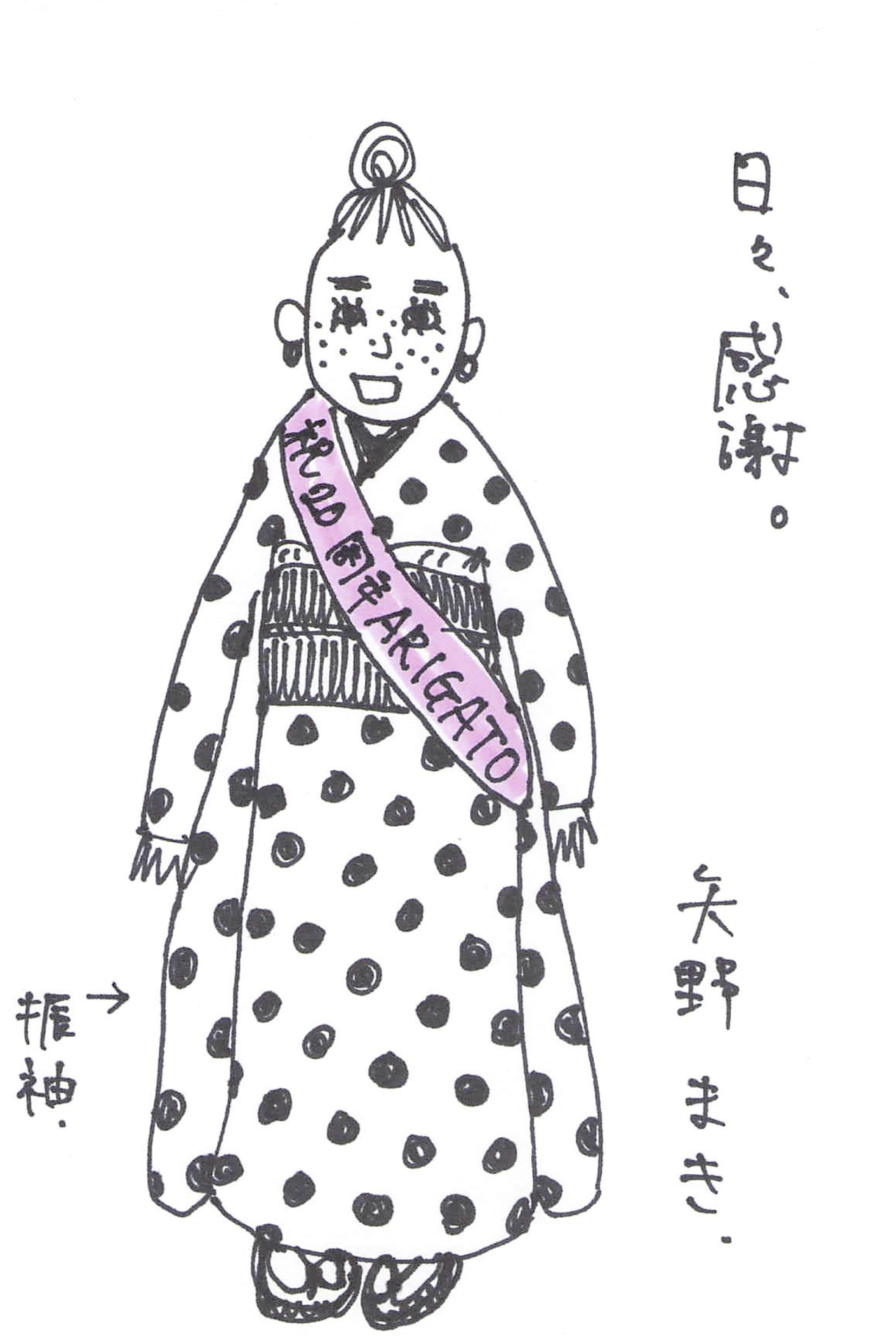 “大丈夫”って言葉、大好き。「君の為に出来る事」にも入ってるけど“大丈夫”と“ありがとう”は言ってもらえると「そうかも」って思える魔法の言葉だから、自分も誰かに言ってあげたい。そんな私が描いたイラストがこちら。これ、わかる? 20周年だから振り袖を着て“ありがとう”をタスキに書いた私。どう?
