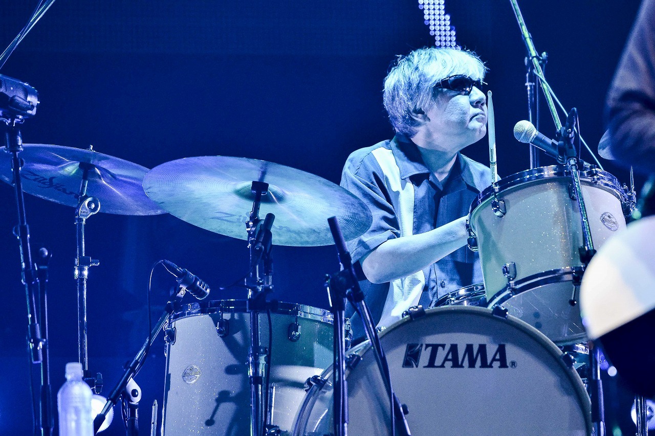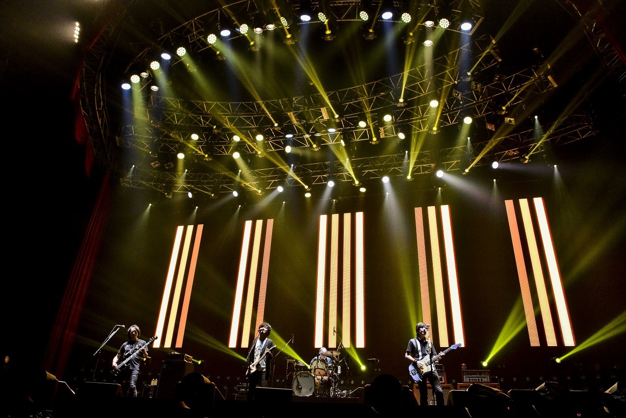 オープニングこそステージの上手と下手に掲げたLEDヴィジョンに映したメンバーそれぞれの子供の頃の写真にナレーションとして、それぞれの母親による談話を重ねるというアニバーサリーらしい演出が加えられていたが、緞帳の向こうで山中が旅の始まりを称えるようにバラードの「この世の果てまで」を歌いはじめ、電光掲示のバンドロゴとともに緞帳が上がってからは、「MY FOOT」「Blues Drive Monster」とぐっとテンポを上げ、前述したように殊更、演出には頼らずに古くは92年発表の「サリバンになりたい」から、新しいところでは18年発表の「ニンゲンドモ」まで、新旧のレパートリーの数々を、テンポよくつなげていった。