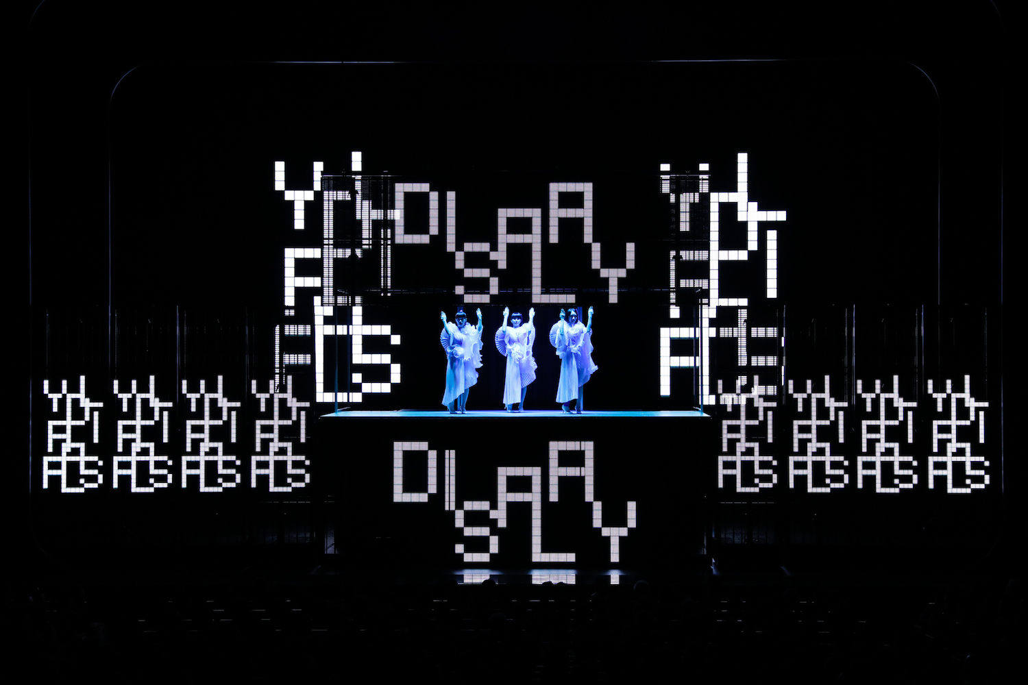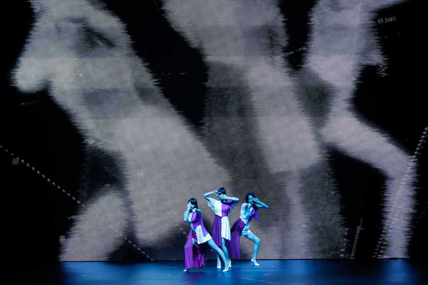 『Reframe 2019』が観客参加型であったことも、特筆すべき点だろう。開催期間中、LINE CUBE SHIBUYAの2階のロビーには「Pose analysis」というブースが置かれ、希望する観客はそこで20秒間の撮影に参加。その服装や動きの解析データが、演出の一部として使われた。そして、ポーズといえば忘れられないのが、人気曲の印象的なワンポーズを、3人が18曲にも渡って生で見せてくれたこと。ああ、そのまま美術館に飾りたいと溜め息が出るほど、生身の3人が創り出すそのポーズはアートなオブジェだった。
