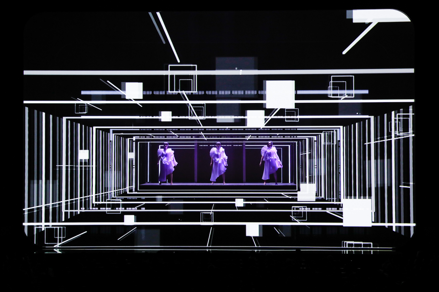 後半「FUSION」、「edge」と攻めの曲が続くと、もはや本物かバーチャルか見分けがつかなり、さまざまな種類のバーチャルPerfumeが徐々に人格を帯びるように感じられた。が、やがてそのバーチャルな3人は、どこか知らない宇宙の彼方に落ちていくように消えていく。聞こえてきたのは、3人の声のカットアップで再構築された「キミ」、「ボク」、「ヒカリ」、「印象」、「連続」といった言葉。気づけば薄明かりのステージに本物の3人が立っていた。そして、「無限未来」。暗がりを揺らぐ光と手を取り合うように踊るそのエレガントなダンスに、じっと目を凝らした。