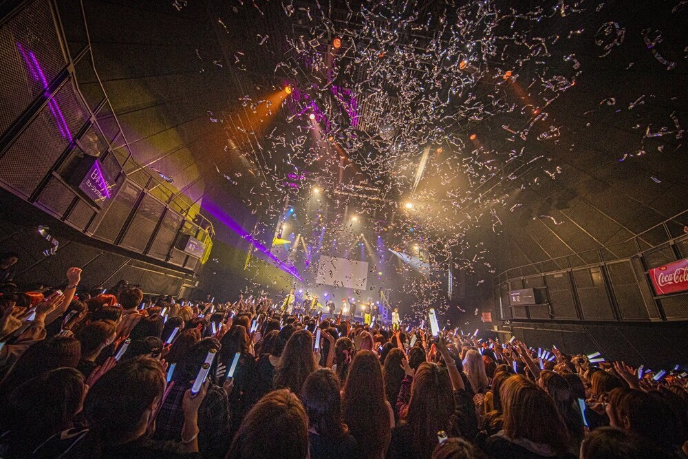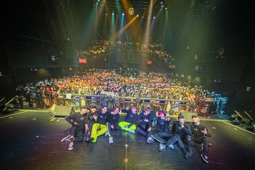 そうしてライブは後半戦へ。この日、パーティーゾーン突入を告げたのは「Brand new day」だった。黒×イエローの衣装に着替えたメンバーたちが、歌いながらサインボールを観客にプレゼントすると、「mirage」ではメンバーの振りマネを観客がIVVYに届ける。“さいくぅ~”とみんなで同じフレーズを口にしながら、じゃれ合うメンバーたちはすでに汗だく状態。HIROTOが「もっと楽しいこと始めよう!」というと、全員がタイルを片手にスタンバイ。IVVYのライブではおなじみのカバー曲「JOYFUL」でタオルをブンブン回してジャンプ。「We like party」ではフロアを左右に分けたダンスバトルが勃発。そのなかで、TAIYU発案のドライブダンスで一体感ある盛り上がりでぶち上がり、最後はダンサーを交えた圧巻のダンスパフォーマンスで「SHOW TIME」を披露。<光る未来まで>と歌ったところで(メンバーのコメント入り)銀テープがフロアに舞い降り、本編は終了した。