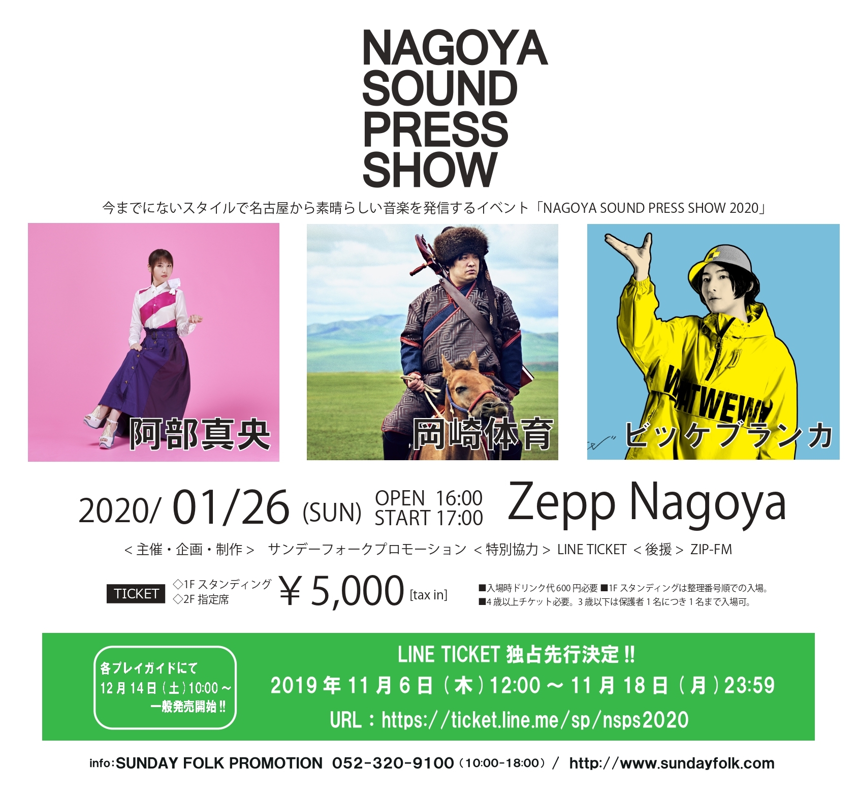 サンデーフォークプロモーション主催によるイベント『NAGOYA SOUND PRESS SHOW 2020』が、来年2020年1月26日(日)にZepp Nagoyaにて開催される。