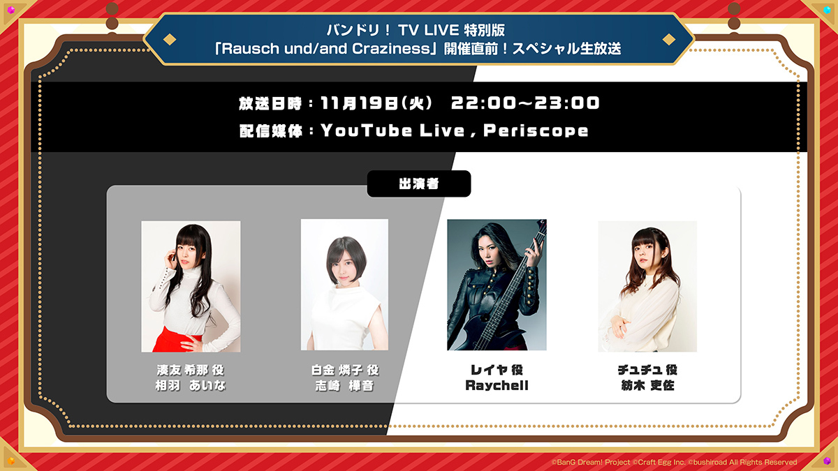 11月19日(火)に『バンドリ!TV LIVE 特別版 「Rausch und/and Craziness」開催直前!スペシャル生放送』の放送が決定した。