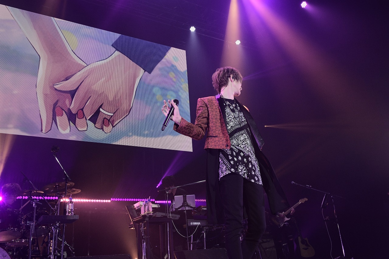 しゅーずの言葉を受け、「シークレットシーグラス」でステージに現れたのはセンラだ。向かい合って歌声を重ねたりかけ合ったり、背中合わせに歌ったり。イベントで何度もコラボをしてきている2人だが、同じく艶っぽい歌声を持つ者同士、初めて一緒に制作したという曲に相性の良さがよく映えて、とても耳心地がいい。