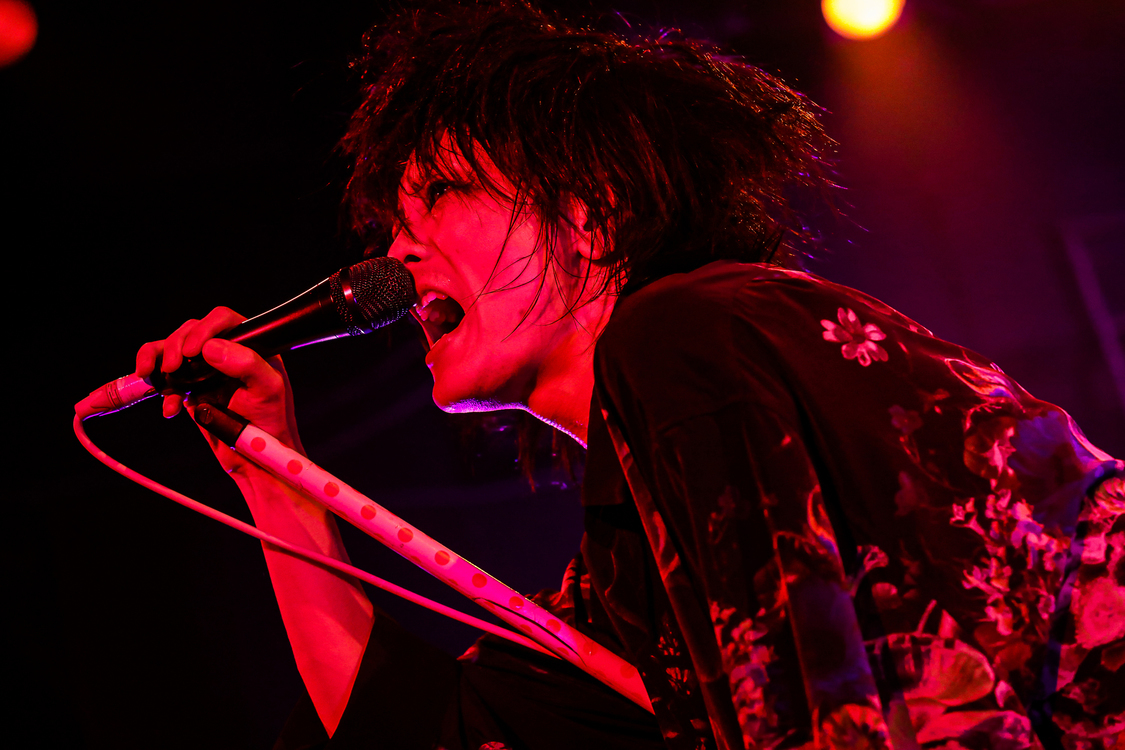 インパクト絶大のパフォーマンスを見せた先攻のdeadmanが去り、いくばくかの時が経過した頃、メリーのステージの幕が開く。場内には歴代のオープニングSEが目まぐるしく鳴り響き、フロアをタイプスリップ感覚へと誘う。ガラ(Vo)、結生(G)、健一(G)、テツ(B)、ネロ(Dr)の5人が舞台に勢揃いすると、ガラがマイクスタンドを頭上に掲げたのを合図に「バイオレットハレンチ」が炸裂。全力で飛び跳ねる観客が続出し、場内には序盤から暑苦しいほどの熱気が広がっていく。この日のメリーは、彼らが得意とする歌心はもちろん、周年公演特有のスパークがメンバーにも観客にも共有されていて痛快だった。たとえば、妖しく卑猥なムードが増幅された「ビニ本2丁目八千代館」や、ガラがマイクを通さずに歌い出し、その後の大合唱へと導いた「ジャパニーズモダニスト」に心打たれるものがあった。