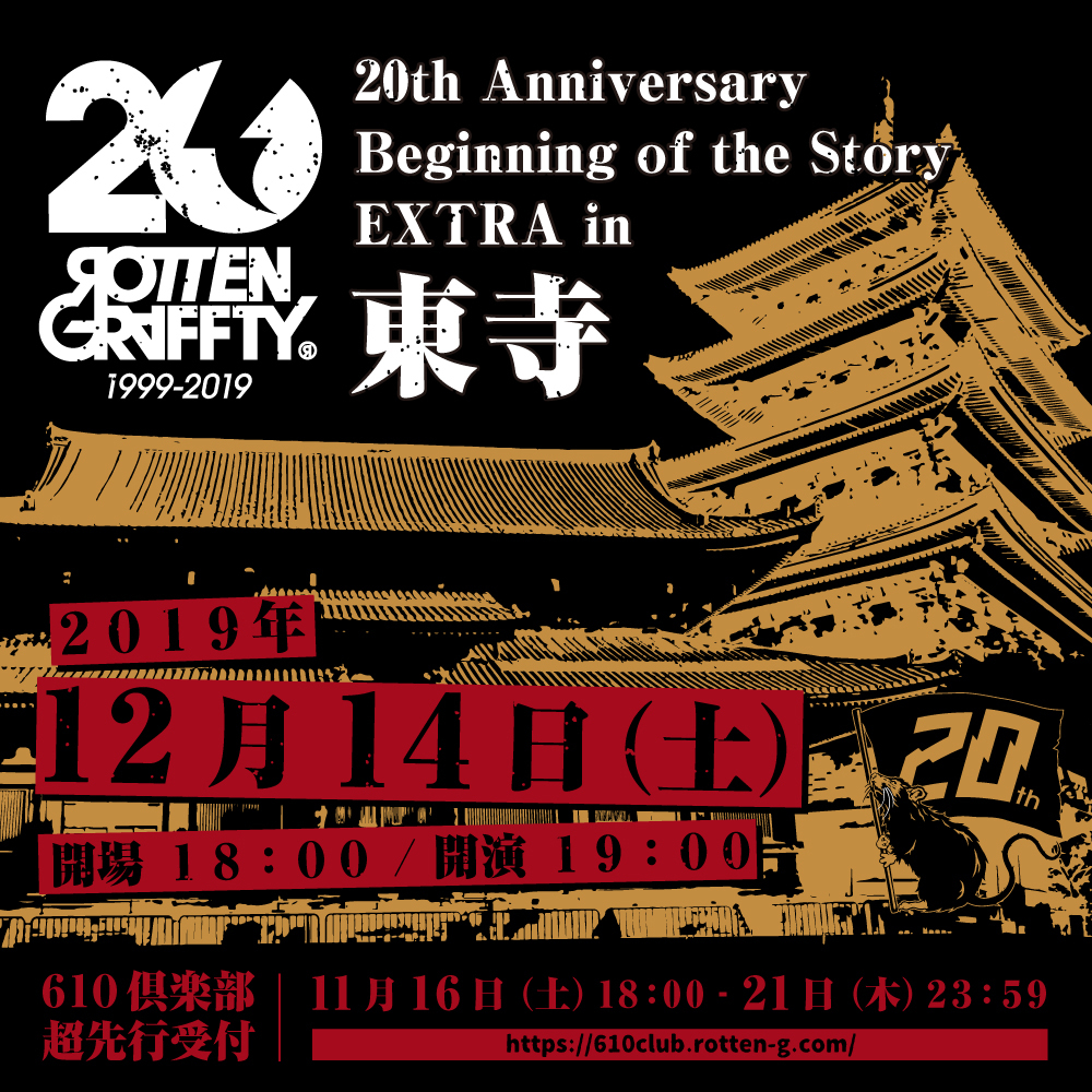 ROTTENGRAFFTYの歴史上において重要な一日になるであろう12月14日。『20th Anniversary Beginning of the Story EXTRA in 東寺』のチケットは本日11月16日より、610倶楽部超先行受付がスタート。詳細はオフィシャルサイトにて確認を。