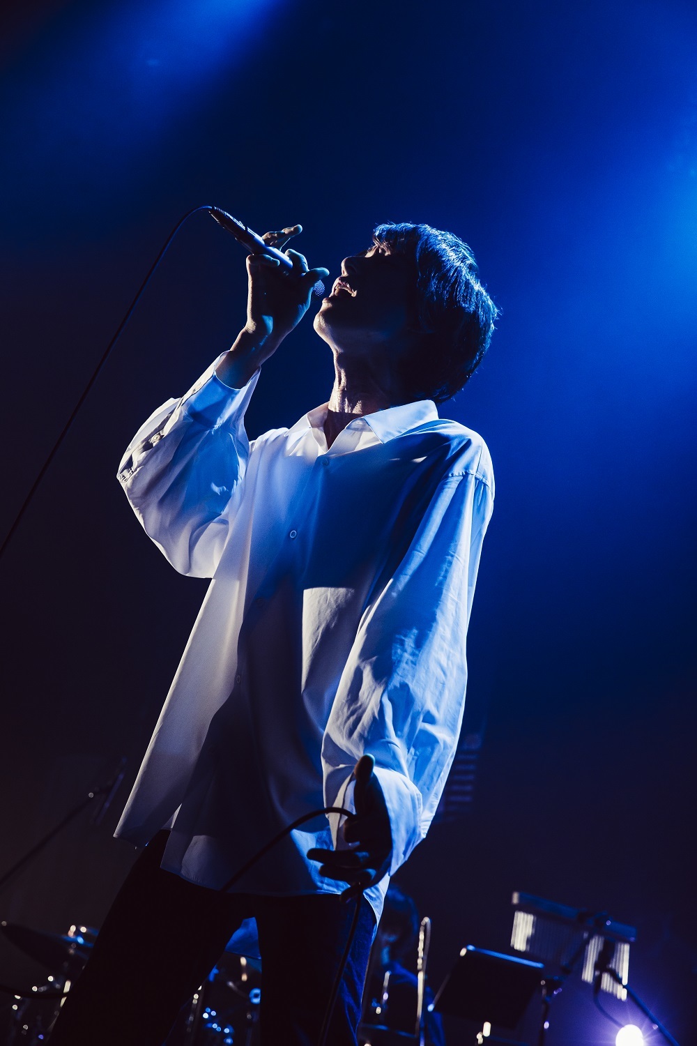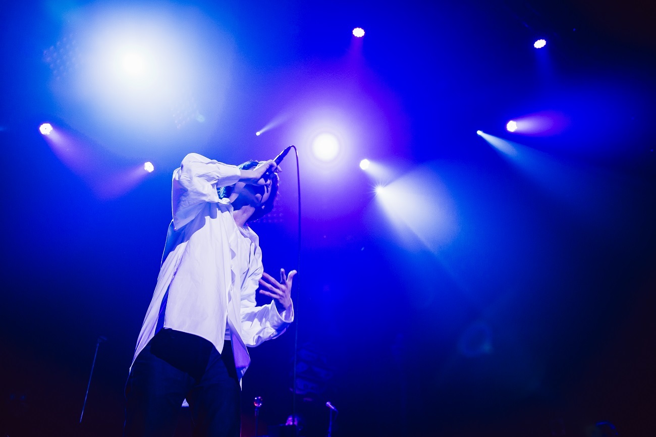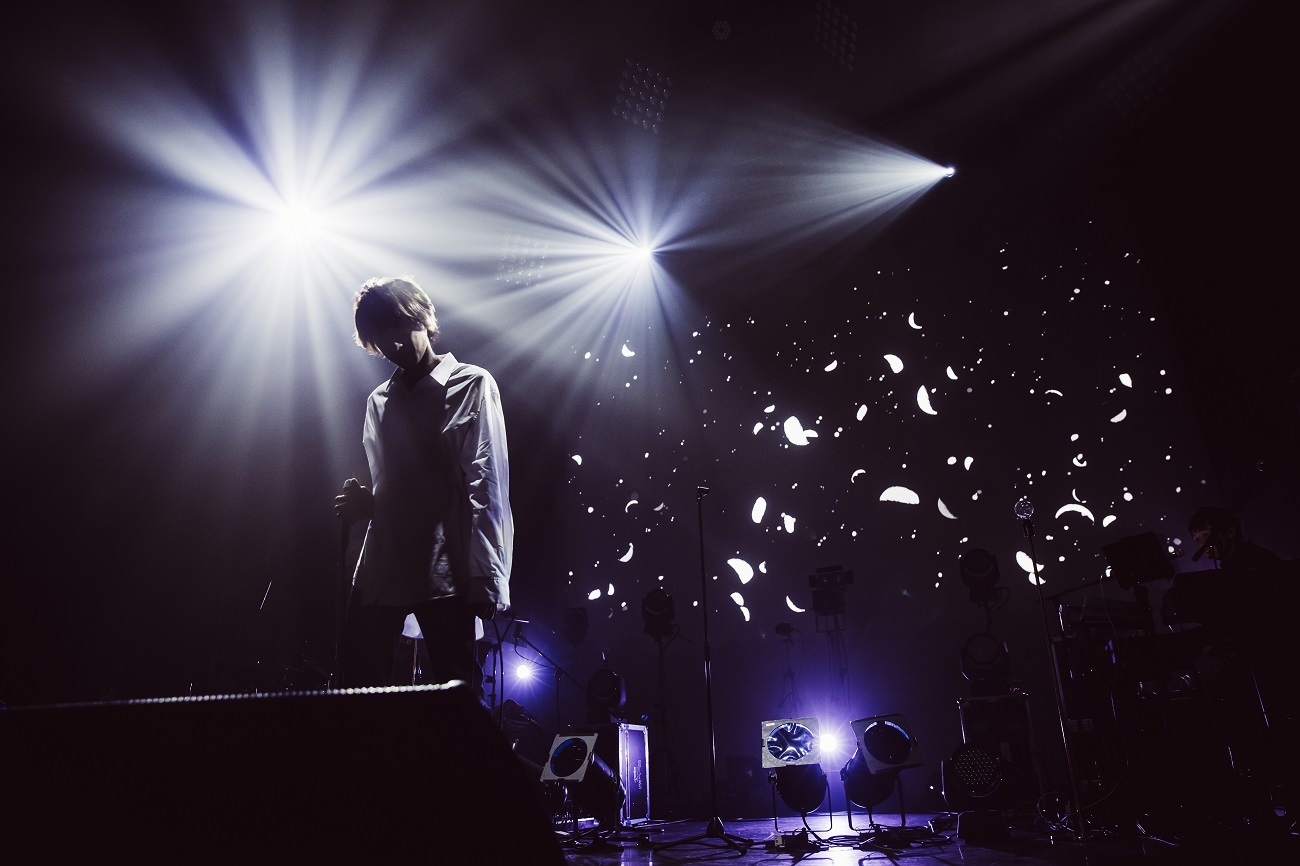 星空を思わせる仄暗いステージに、真っ白なシャツ姿で軽やかに登場した歌詞太郎。「ようこそ!」との呼び掛けを交え、まずは落ち着いてスタート地点を定めるように「北極星」を歌い届けた。「つながって」ではカラフルなバルーンがフロアを転がり、「惑星ループ」ではレーザーがフロアを貫く。メディアには顔出しをしていないが、追加の3都市公演ではカメラクルーを導入し、その表情や動きが大写しに。「365」では舞い散る花びらのイメージが映し出されるなど、曲に合った映像表現も効果的。だが、様々な演出以上に胸を打ったのはやはり、歌詞太郎の歌声である。一言一言をはっきりと発音し言葉を届けようとする歌い方、絶唱しても終盤まで衰えることのない声量、高低を自在に行き来する音域、艶やかで凛とした声の響き。すべてにおいて破格の歌声は、オリジナルもカバーも分け隔てなく歌に命を吹き込み、生きた言葉となって聴き手の心に飛び込んでいく。