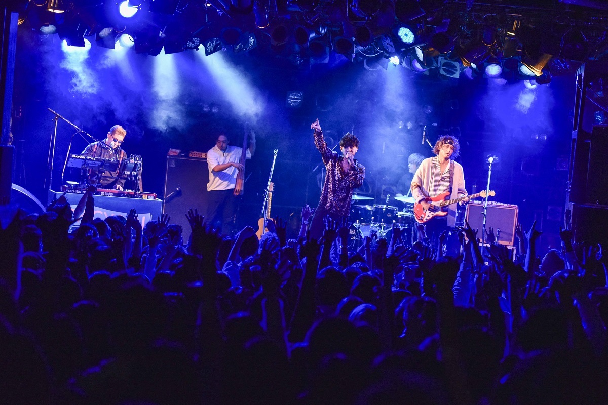照明が落ち「ヤバイ!」という歓声がこだまする会場。「Easy-Interlude-」を彷彿する波の音に乗りメンバーが登場すると、「Traffic Jam」でライブが封切られた。『EASY-EP』に沿った幕開けに、オーディエンスのボルテージはすでに最高潮。1曲目にも関わらず巻き起こったシンガロングは、彼らが熱狂の中心にいることを物語っていた。優しい声で「#goodday」を歌いあげると、キラーチューンの「Mellow Yellow」へ繋がれる。ギターソロではAKUNがステージギリギリまで来てパフォーマンスで魅せつけた。自由に生きればいいさと語り掛ける「BOHO」、未来予想図の意を持つ「Cyanotype」と、流れるようにライブが展開されていく。