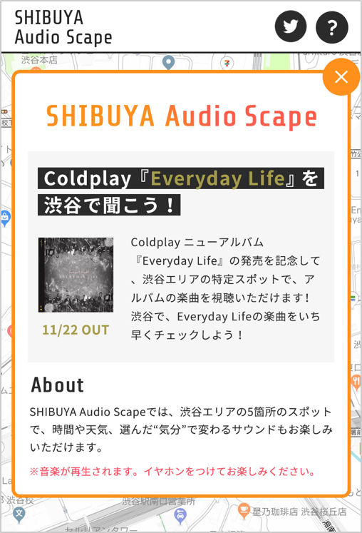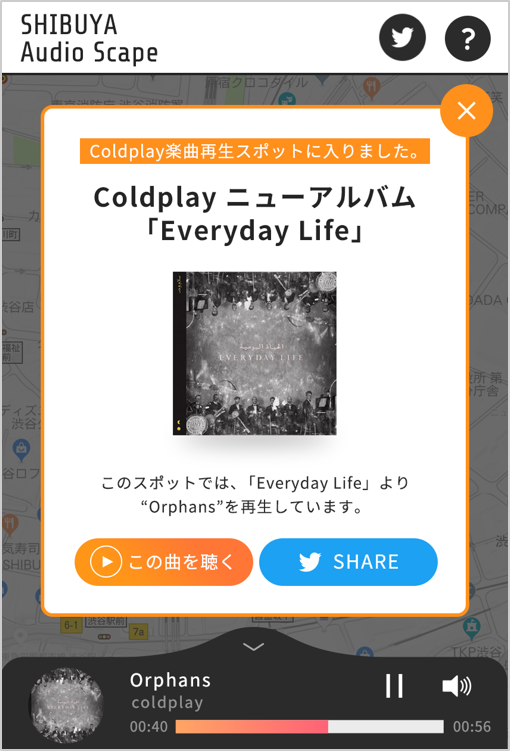 コールドプレイ最新曲「オーファンズ」を渋谷の街で試聴できる音のAR「Audio Scape by au」本日より実施
