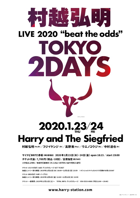 村越弘明(Harry)が、年明け2020年1月23日(木)、24日(金)にマイナビBLITZ赤坂にて2DAYSのワンマンライブ『Live 2020 "beat the odds"』を行うことが決定した。