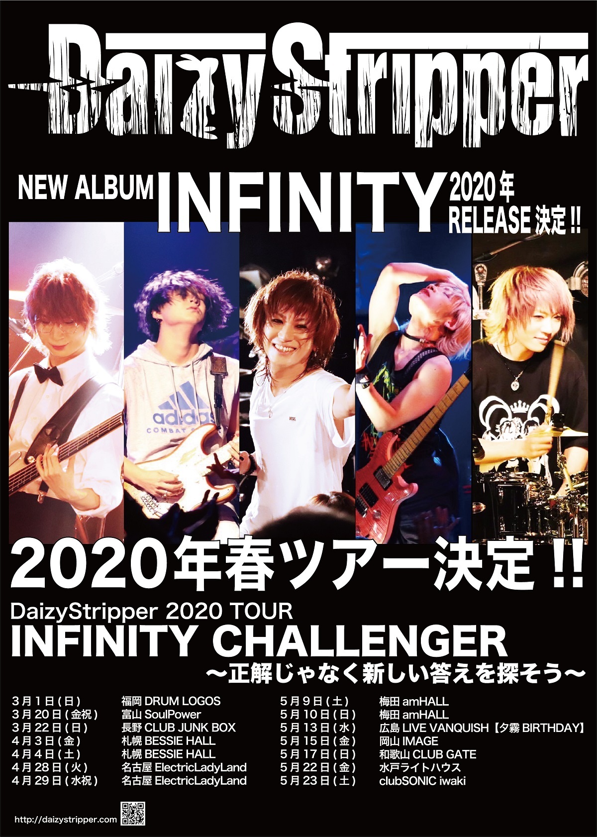 DaizyStripperがニューアルバム『INFINITY』を2020年にリリースすることを発表。さらに、本作に伴うツアー『DaizyStripper 2020 TOUR INFINITY CHALLENGER~正解じゃなく新しい答えを探そう~』の開催を発表した。