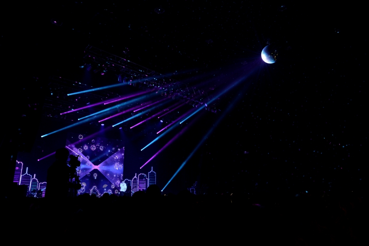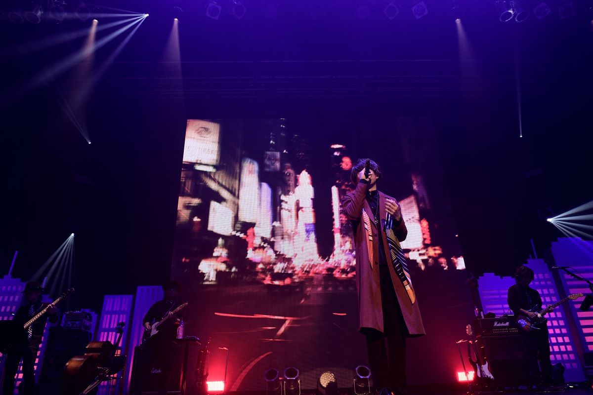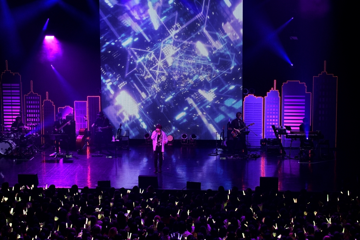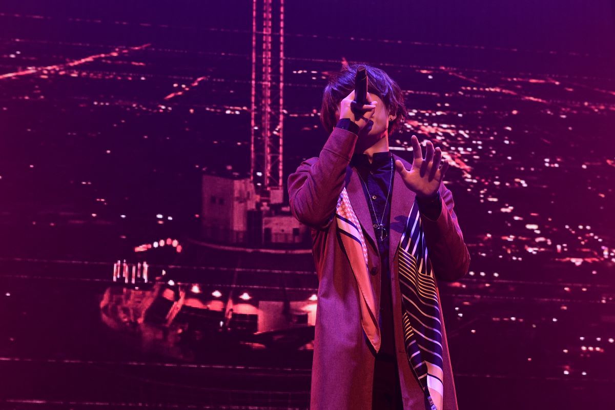 ドイツ語で“嘘”を意味する言葉を冠した『Luge』の楽曲を全曲披露したこの日、オープニングナンバーはアルバムのラストを飾る「シックスセンス -6th SENSE-」だ。ネオンに彩られる都会のビルを模したセットが組まれたステージに現れた、ロングコートをスタイリッシュにまとうセンラ。「今日はみんなで楽しんでいきましょう!」と呼びかけ、嘘に翻弄されながらも<信じたい>という想いを託したしなやかで艶のある歌声を響かせれば、一気に惹きつけられてしまう。
