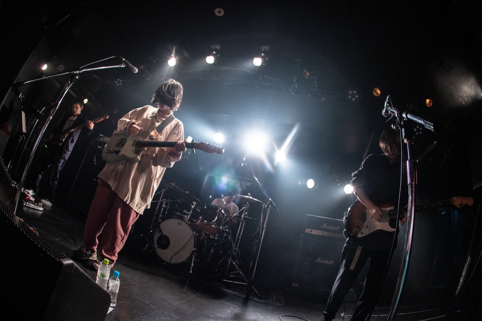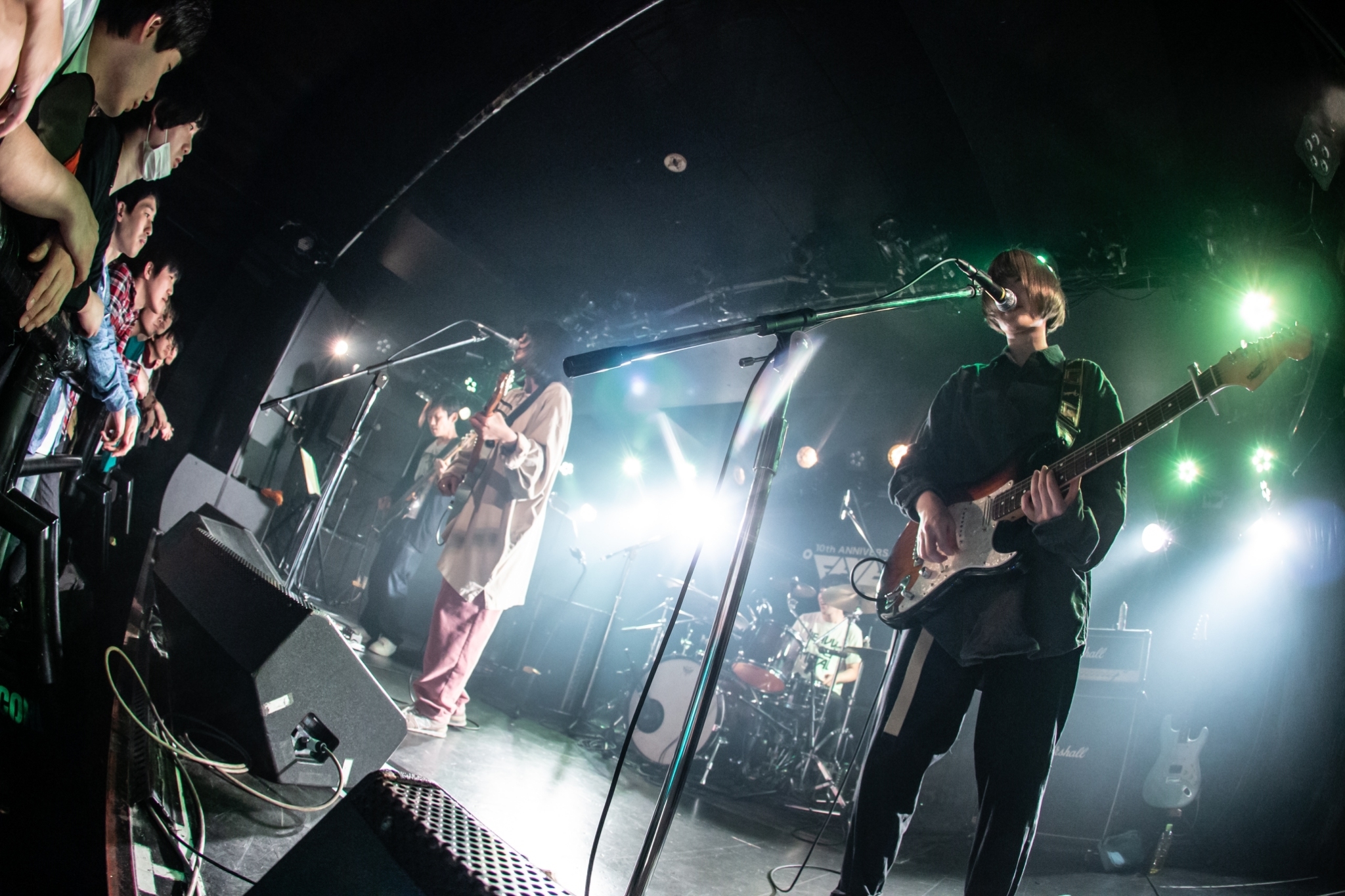 そして、「生まれ変わったら猫になりたい」という想いをこめて、肩のちからを抜いたミディアムテンポ「のらりくらり」や、ファンキーなグルーヴを聴かせる「連れ去ってサラブレット」のあと、ひときわ大きな歓声が湧いたのは、バンドの存在を広めるきっかけになった「メトロポリタン」だ。曲調こそフロアのハンドクラップを誘うほど軽やかだが、恋愛におけるドロドロとした情念が込められた独特の歌詞は、敬愛するスピッツ・草野マサムネの世界観にも通じるものがある。ふだんは人見知りでコミュニケーションが苦手だという水上が、音楽だからこそ、自分の感情と真っすぐに向き合い、丁寧に紡ぐ言葉たちは、どことなく歪だが、とても切実な想いが滲む。