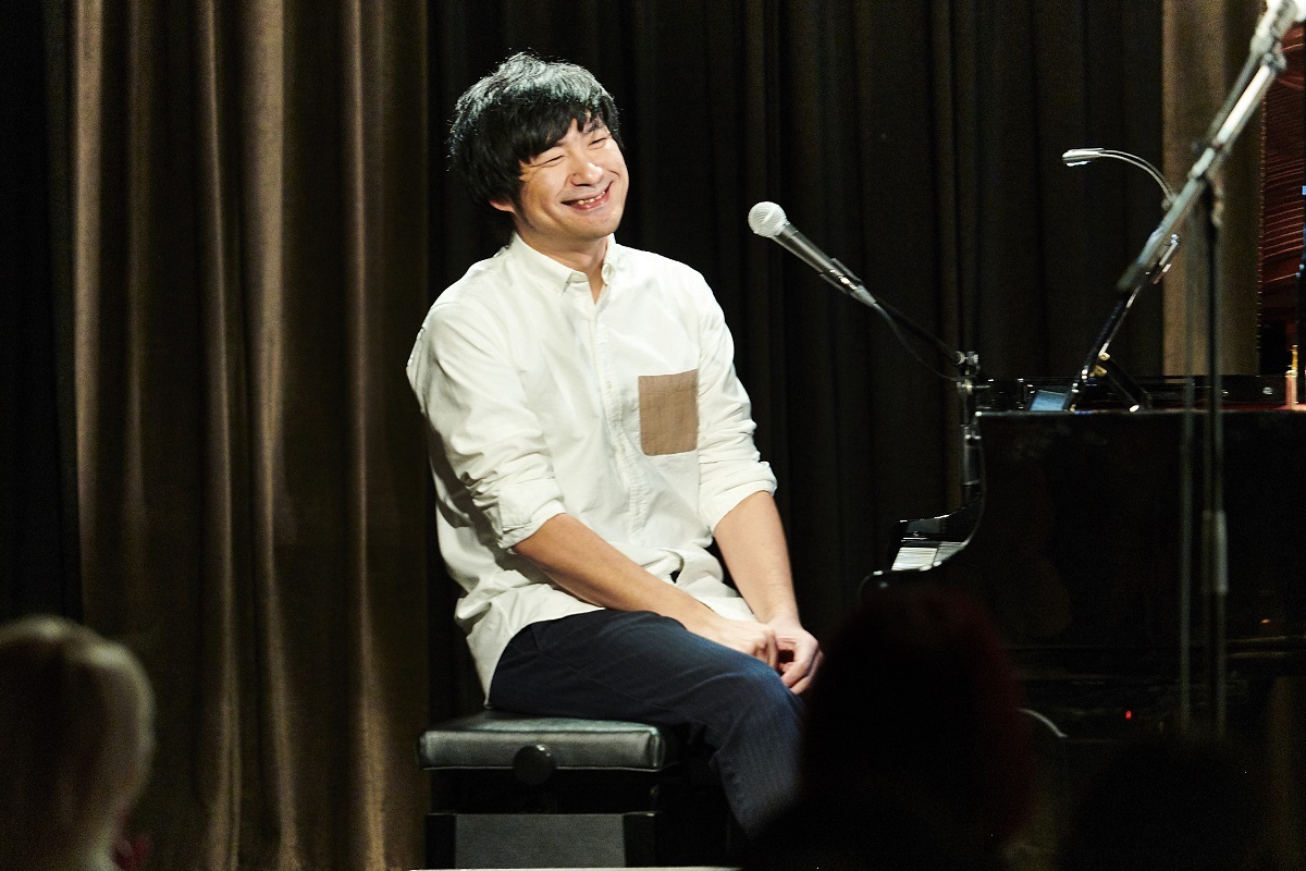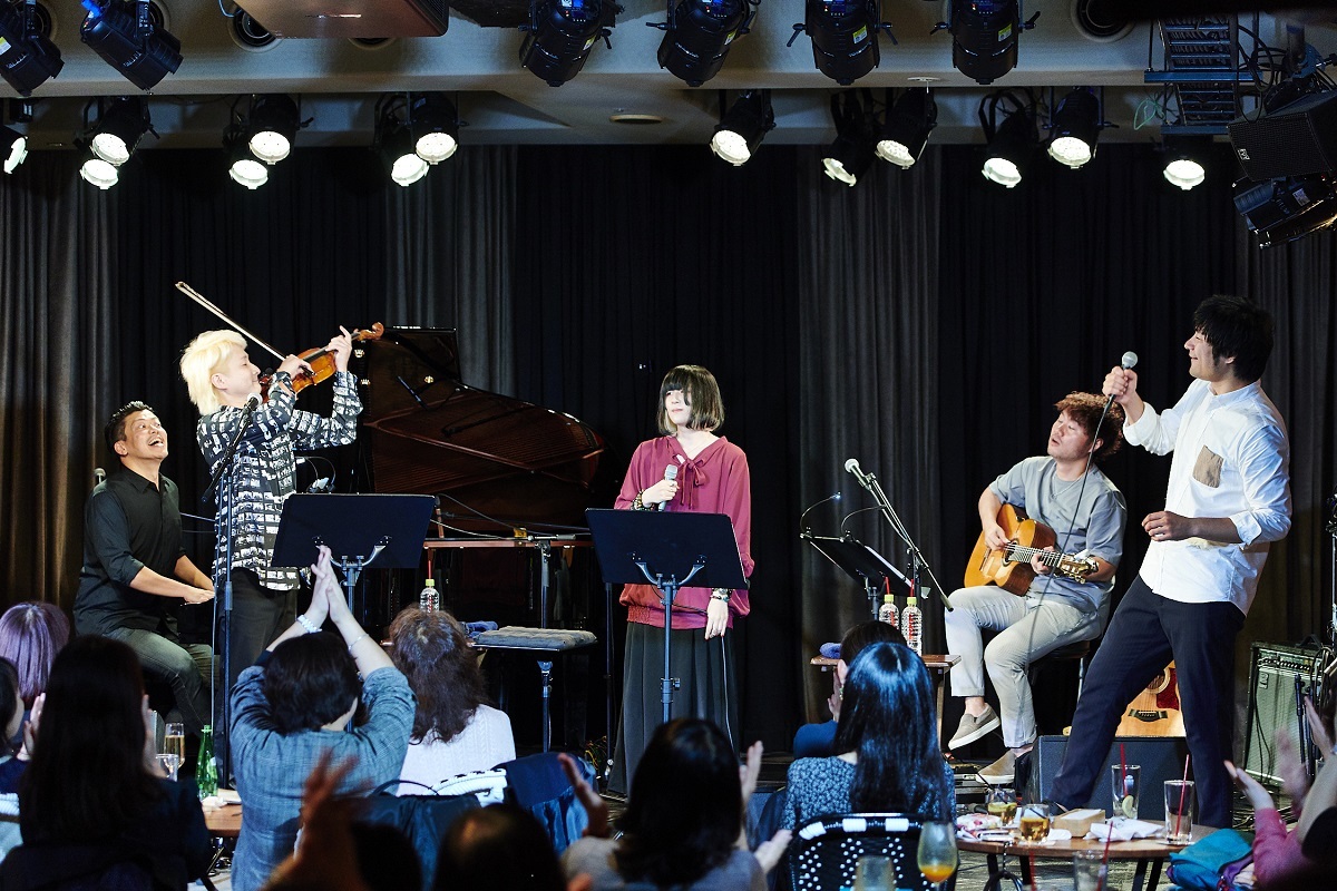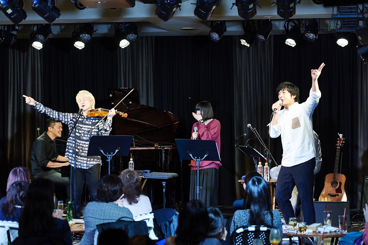 互いに多忙なため、会ってもカレーだけ食べて別れることもよくあるらしい。「ドライな関係です(笑)」と浜端が言うと、「カレーなだけに」とすかさずNAOTOが突っ込む。客席からは笑いが絶えない。遠山哲朗(G)と呉服隆一(Pf)を加え、陽気な飲み会ソング「グビッ!~はたらき蜂賛歌~」では、宴会の盛り上げ部長のように、人生の転機をドラマチックに綴る応援歌「カーテンコール」では、親身になって相談に乗ってくれる親友のように。圧倒的なボーカルの中に、陽気な包容力とシリアスな感動を併せ持つ、浜端ヨウヘイは大きな歌を歌う大きな男だ。