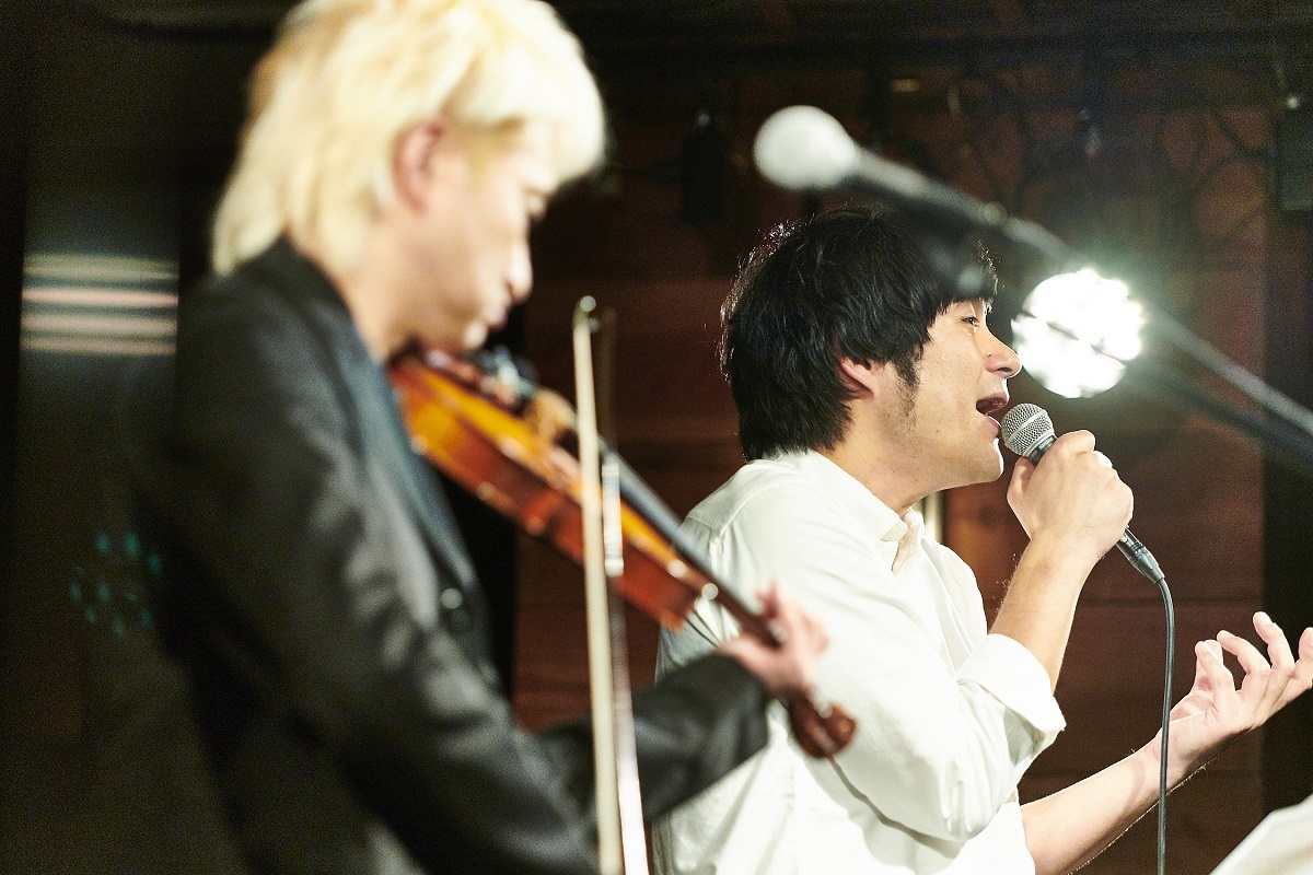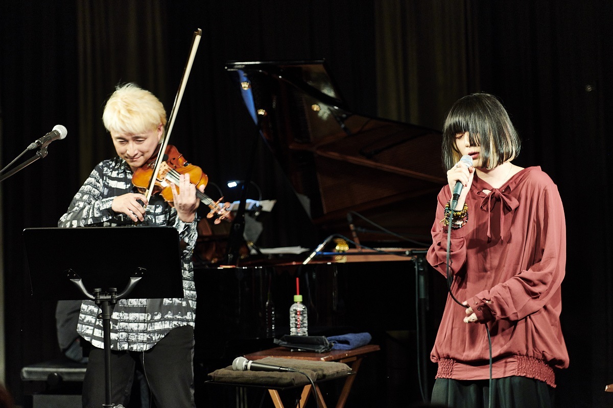 ステージに上がったその男は、192センチの堂々たる体格の、しかし実に陽気でフレンドリーなジェントルマン。シンガー・ソングライター浜端ヨウヘイとNAOTOは、度を越したカレー好きという共通点を持つ普段からの友人同士だ。いきなり楽しいトークに花が咲くが、マイクに向かうとがらりとムードが変わる。「北野坂」は神戸に実在する地名を織り込んだロスト・ラブバラードで、ピアノを弾きながら歌うパワフルな声量は圧巻のひとこと。バイオリンはあえて控えめに、しっかり歌を支えている。