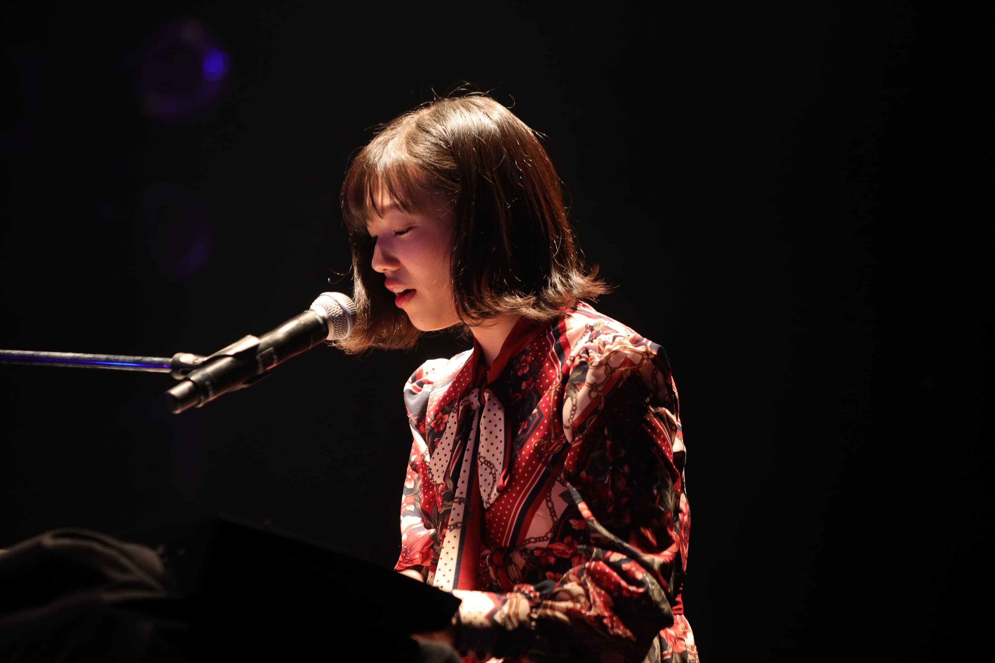 続いて、ソロ築田行子が登場し「Flashback」を披露。新しい赤い衣装はこの曲の大人な雰囲気にぴったりで、会場は一気に彼女に魅了される。