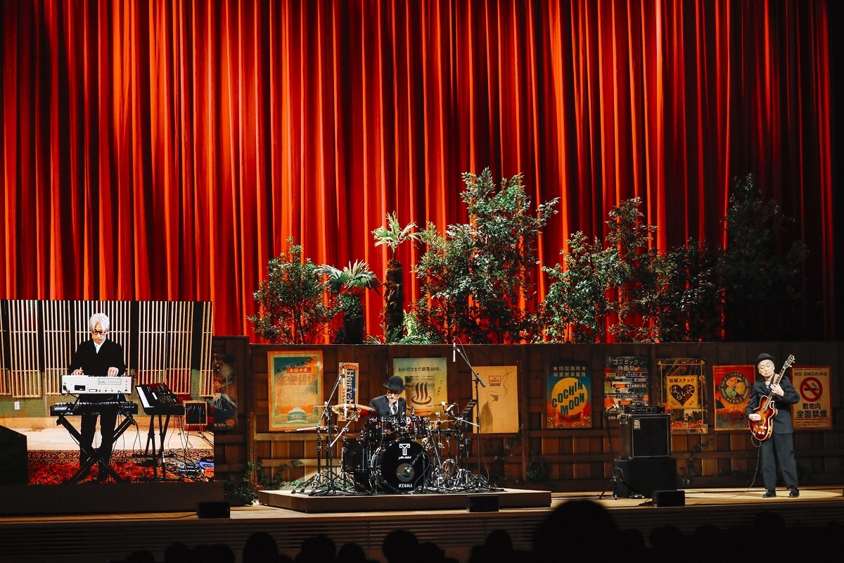 そしてハイライトは、細野晴臣、高橋幸宏、坂本龍一の3人によるコーナー。コント「噛み合わない会話」では、坂本龍一が映像で出演し、その映像に合わせて3人が文字通り噛み合わない会話を繰り広げる様子が、爆笑を誘いました。そして、その後坂本の演奏映像に合わせて、細野、高橋が今度はバッチリ噛み合った演奏を披露すると会場のボルテージは最高潮に達した。