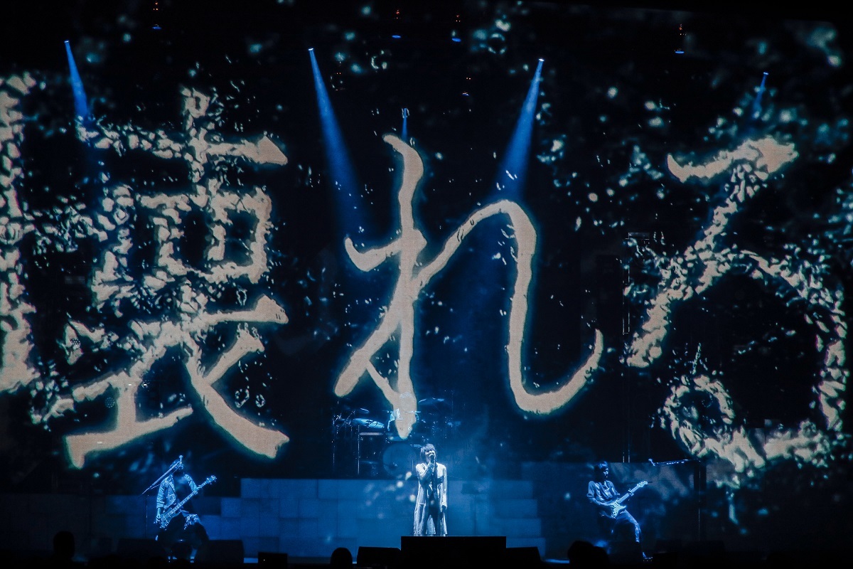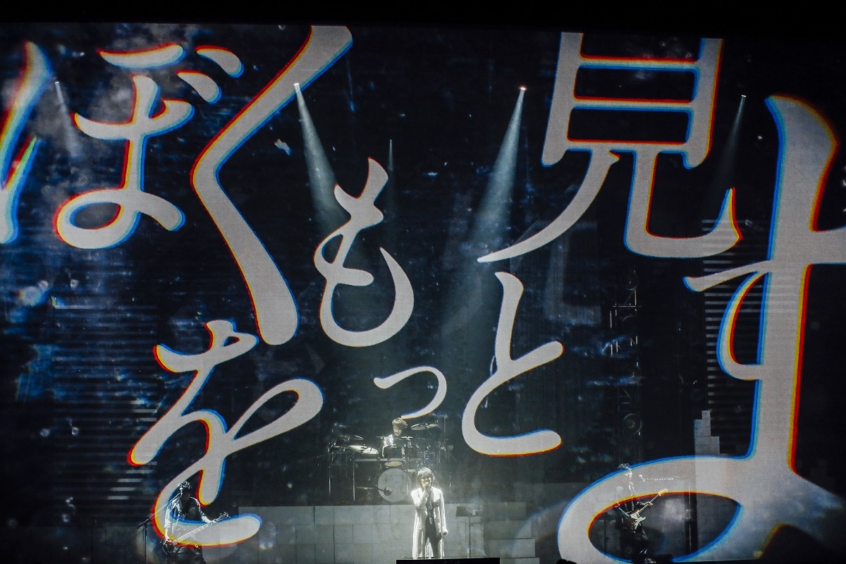 ここからは、あたたかいムードのスロー/ミドルチューンを三連発。「2月」は明るく力強く、「手」はShinjiのアコースティックギターと共にもの悲しく、「淡い足跡」は柔らかく優しく。曲間には字幕のモノローグが、曲中では歌詞がスクリーンに映し出され、『承認欲求』という現代の病をじっくりと読み解いてゆく。かつてないコンセプチュアルな、シアトリカルな演出に、ライブでありながら劇場にいるような気分になる。シドの楽曲をふんだんに散りばめた、これは一つの物語。アップテンポで盛り上がる「罠」も、騒ぐというよりはかみしめる。聴き慣れた歌詞にあらためて聴き耳を立てているような、不思議な感覚。