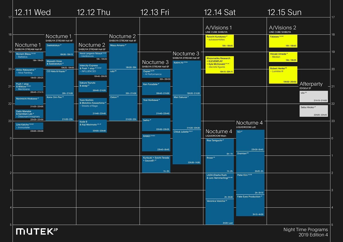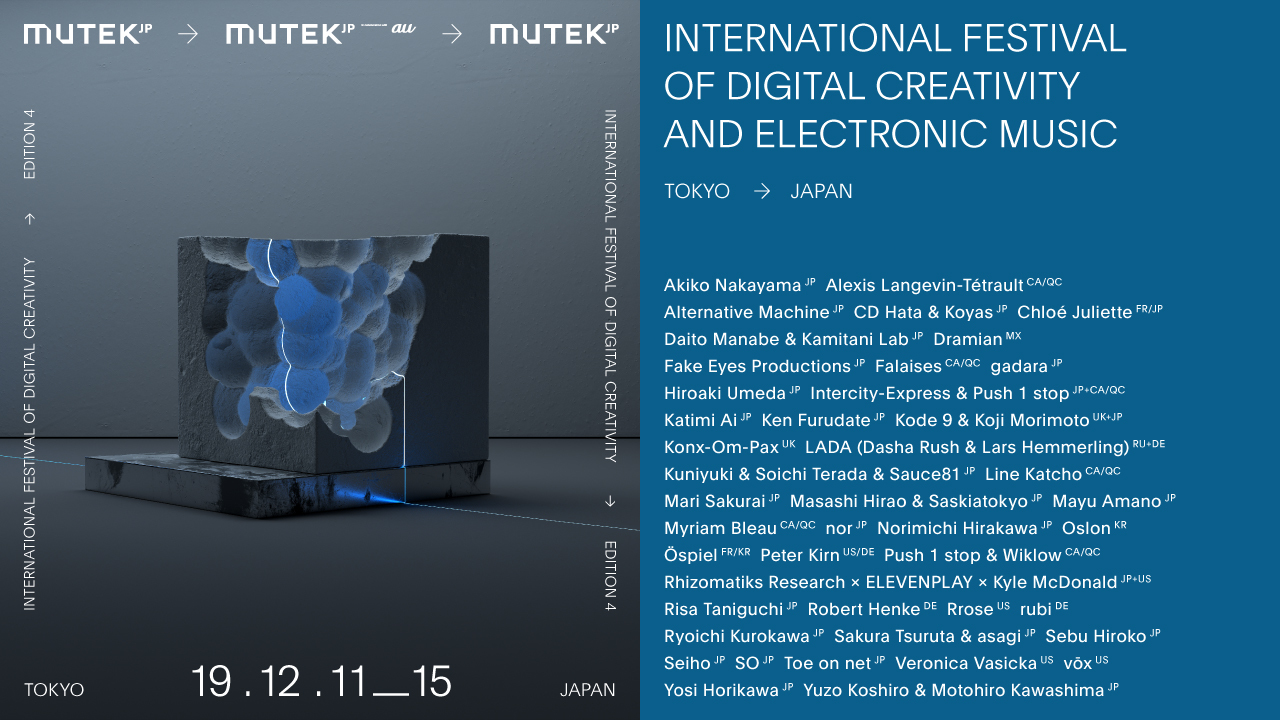 12月11日(水)~15日(日)まで渋谷の各所で開催されるカナダ・モントリオール発祥のオーディオヴィジュアルアートと電子音楽の芸術フェスティバル『MUTEK.JP 2019』のタイムテーブルが発表された。