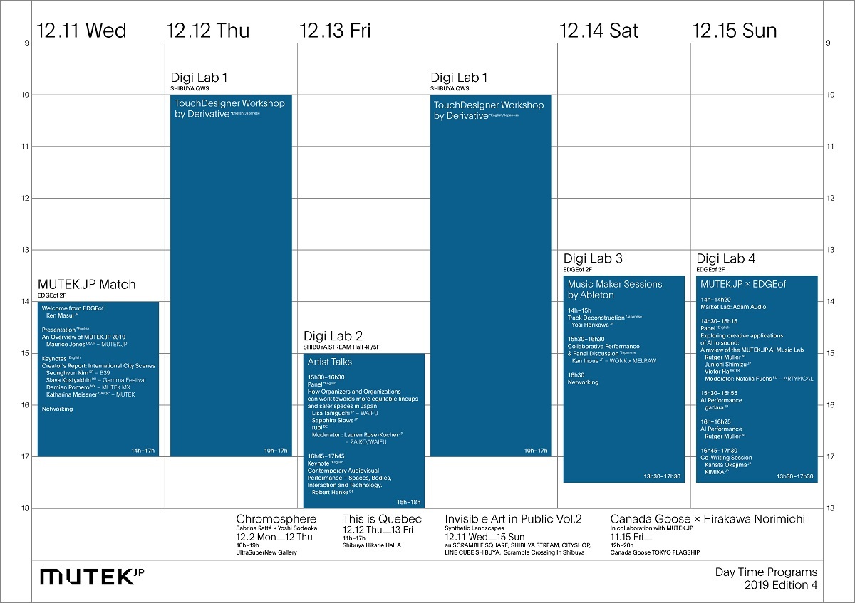なお、無料プログラムとして、12月12日(木)&13日(金)は、活発的なデジタルクリエイティヴな業界を紹介する国際展覧会「THIS IS QUEBEC x MUTEK」が渋谷ヒカリエ ヒカリエホールAで開催される。