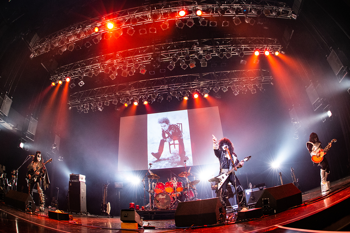 続いて登場したのは、史上最大規模のファイナルツアーを行っているモンスターバンド・KISS、ではなくそのトリビュートバンドのMAKIN’ LOVE。しかし、トリビュートとは言え侮ることなかれ。MAKIN’ LOVEは、KISSの形のみではなくSpiritsまでを継承するとして1995年より活動を続けている本格派バンド。KISSといえばhideが少年時代に衝撃を受け、ロックンロールの世界にのめり込んでいくきっかけとなったバンドである。KISSの載っている雑誌を買い漁り、ファンクラブにも入会したhideが毎日のように自宅の郵便受けの前で会報を待っていた逸話は、ファンの中では今でも語り継がれるほど。幕が上がればそこには格好だけではなく、所作も佇まいもKISSの4人が。「Detroit Rock City」、「Deuce」など往年のヒットソングを披露し、ジーン・シモンズの火吹きや血を吐くパフォーマンスまで行う徹底ぶり。「hideちゃんが大好きだったKISS、みんなで楽しみましょう!」と「Shout It Out Loud」、「LOVE GUN」と荒々しいロックンロールナンバーを立て続けに披露し、ラストナンバーはKISSのライヴでもエンディングで演奏されることが多かった「Rock and Roll All Nite」。会場からシンガロングが生まれ、hideが愛したKISSを通して、全員が一つになった様子が印象的であった。