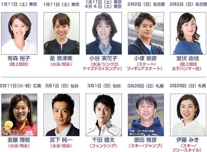 ・1月11日(土) 東京公演:有森裕子(陸上競技)、星奈津美(水泳/競泳)、小谷実可子(水泳/シンクロナイズドスイミング※)