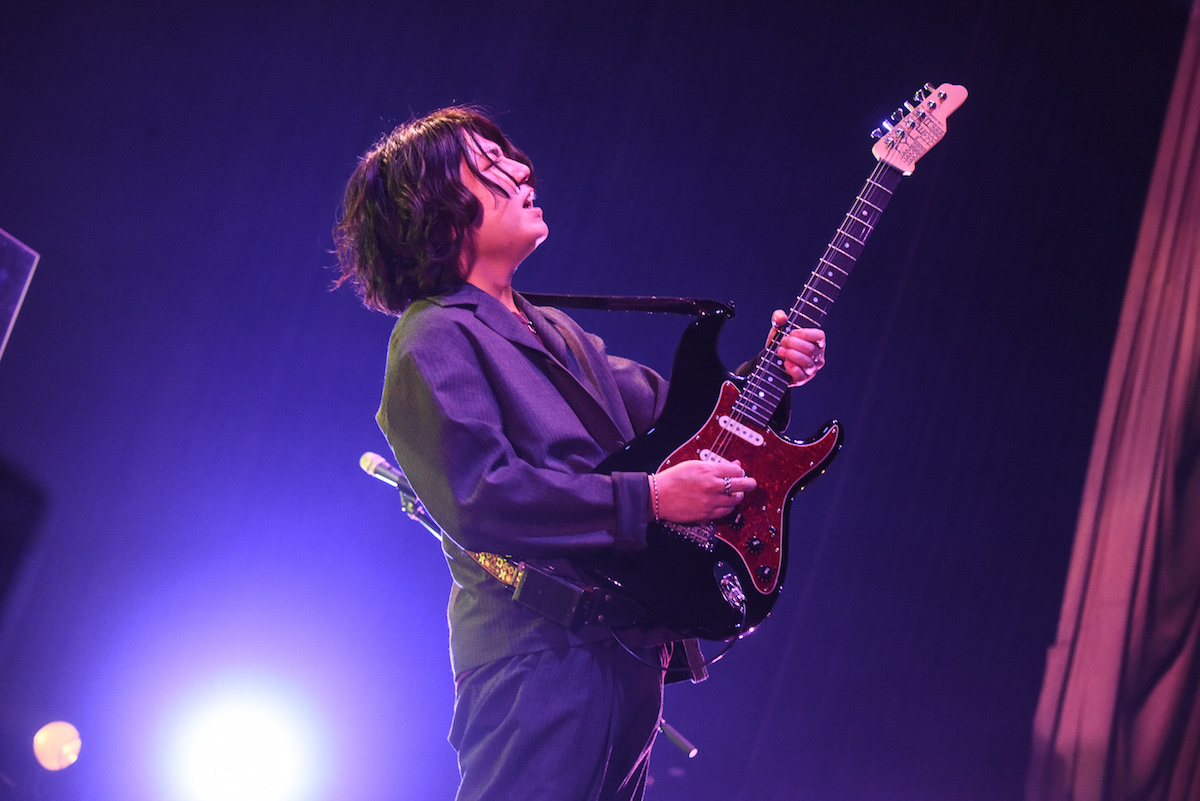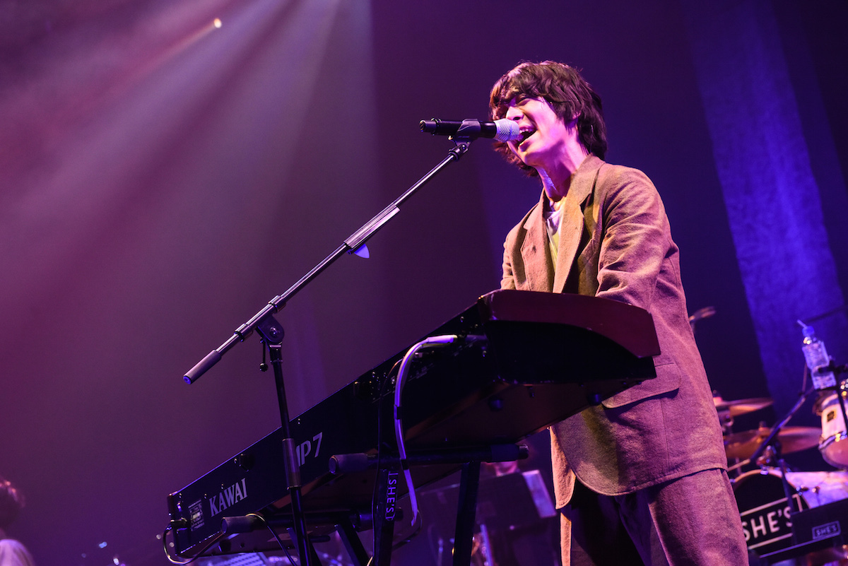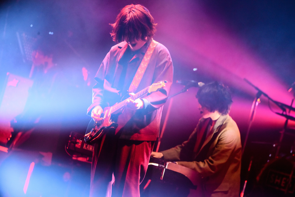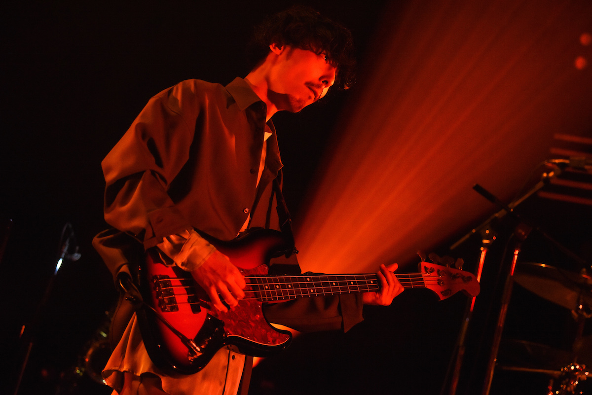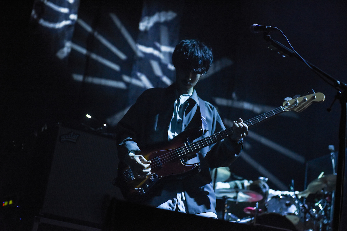ライブが始まってまず気づいたのは、メンバーがみなこれまで以上に楽しそうなこと。「Over You」のイントロが華やかに弾けるやいなやステージの前方ギリギリまで駆け出してピョンピョンと跳びはねてみせる井上竜馬(Vo/Pf/Gt)。木村雅人(Dr)が前の3人のことをしっかり目で追いながら笑顔でリズムを刻み、「Un-science」のギターソロではお立ち台に上った服部栞汰(Gt)が気持ちよさそうに海老反りになってスポットライトと歓声を浴びる。ポーカーフェイスの広瀬臣吾はあんまり見た目上変わらないシュアな演奏だが、かなり早い段階から定位置を離れてプレイしたり、いつもより大きめにアクションしている。気がする。要は、4人がとても自然体に、自信を持ってプレイしていることがよくわかる立ち上がりだ。