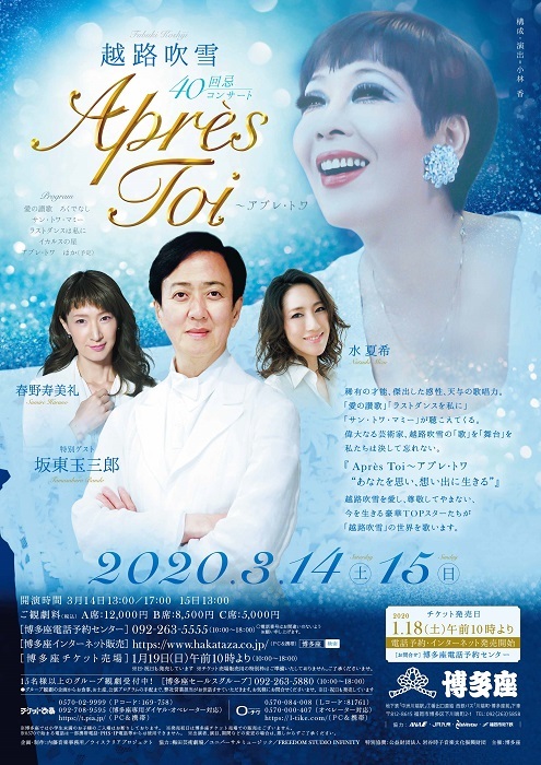 『Aprés Toi~アプレ・トワ』は、越路吹雪40回忌にあたり開催されるコンサートで、坂東玉三郎と宝塚OG達が、敬愛する越路吹雪の世界を歌うスペシャルなコンサート。「愛の讃歌」「ラストダンスを私に」「サン・トワ・マミー」などの、越路吹雪が魂を込めて歌い続けたシャンソンを歌い繋ぐ。若き頃、越路吹雪のリサイタルに10年間通い続け、実際に目の当たりにしてきた玉三郎の歌は、聞く者に圧倒的な感動を与える。越路吹雪の真髄に玉三郎の魂が触れて、そこから紡がれる歌は、他に代え難い力が宿っている。また、越路吹雪と同じ宝塚にルーツを持つOG達の歌は、独特の色気と魅力に溢れている。2019年11月に東京で開催されたときとは、異なるキャストでの開催となり、博多座でしか観ることができない豪華なキャストが揃った。